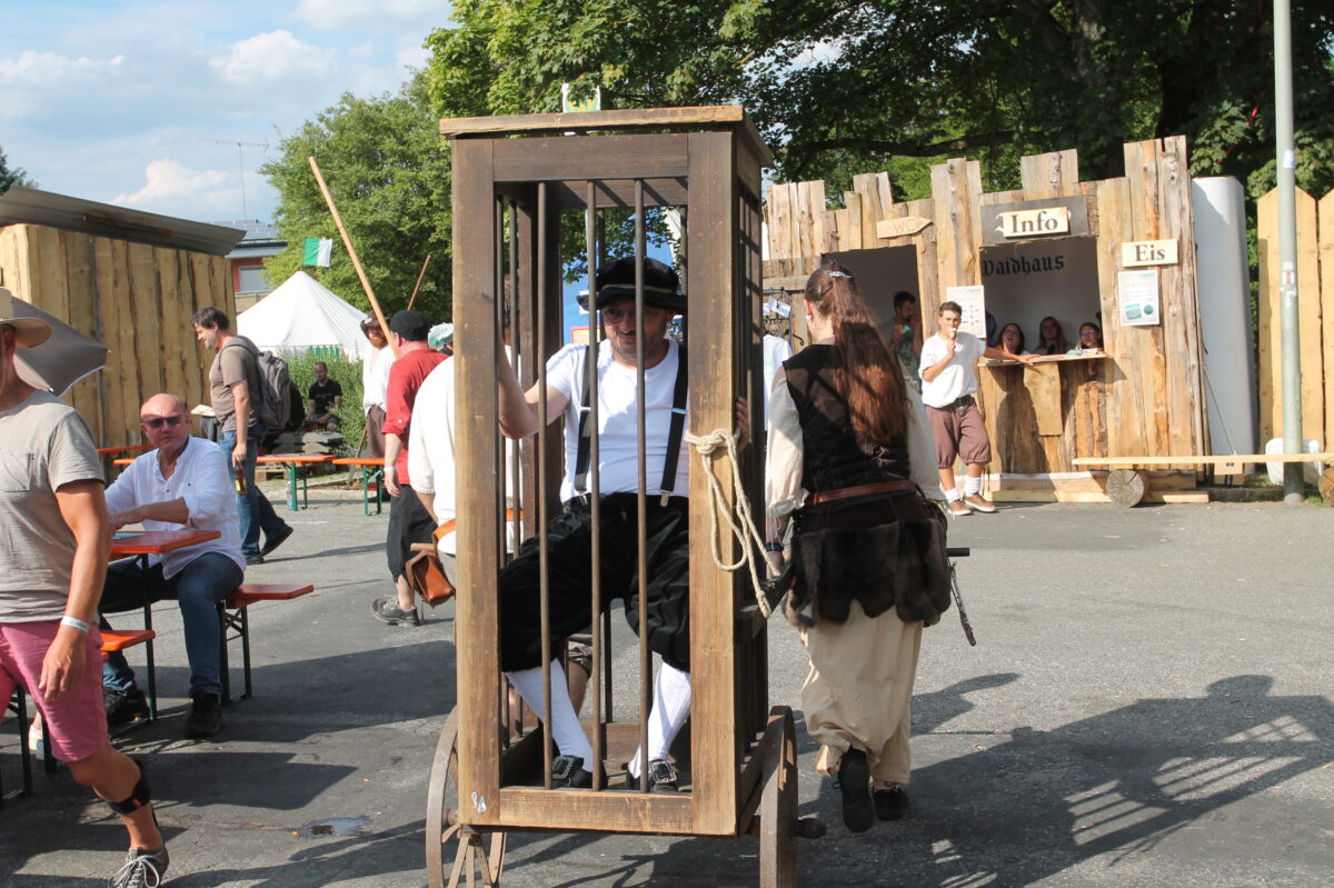 „Ihr seid der Wahnsinn“, ruft zum Ende des dreitägigen Spektakels der Bürgermeister allen Akteuren und Gästen zu. Ob er da schon weiß, was ihn erwartet? „Hubert der Henker“ lässt jedenfalls nicht locker und will das Gemeindeoberhaupt beim „Marktgericht-Schafott“ köpfen. Und so ist er auf der Suche, was denn Markus Bauriedl angerichtet haben könnte. Der Ankläger kann zunächst absolut nichts finden. „Im Rathaus läuft’s, der Mittelalter-Markt ist perfekt über die Bühne gegangen.“ Dann aber doch: „Der Bürgermeister ist ein Tipferlscheißer“, hat Hubert herausgefunden. Jetzt helfen auch die mehrfachen Einwände des Hauptmanns Georg Tumbky (Andreas Ringholz), der immer wieder „unschuldig“ in die Menge ruft, nichts mehr.