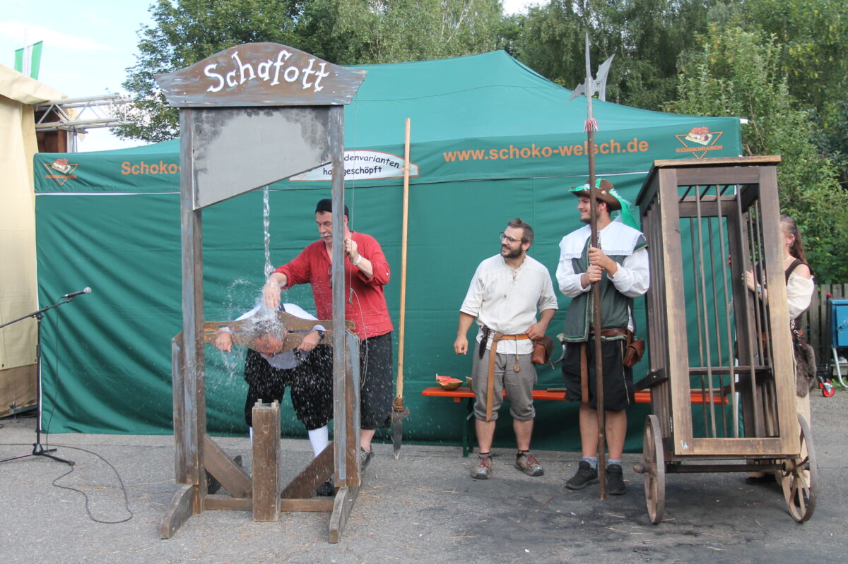 Das Urteil steht: Der Bürgermeister wird geköpft. Wie gut, dass das Schauspiel natürlich ein gutes Ende nimmt. Der Rathauschef kommt unter dem Beifall der Leute mit einer Wasserdusche davon. Und die tut aufgrund der hochsommerlichen Temperaturen sogar richtig gut und macht den Weg frei für den letzten Auftritt der „Amici Musicae Antiquae“.