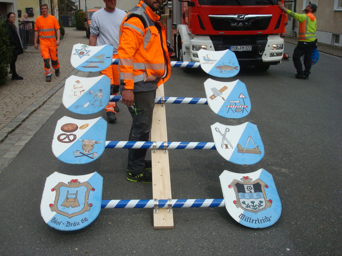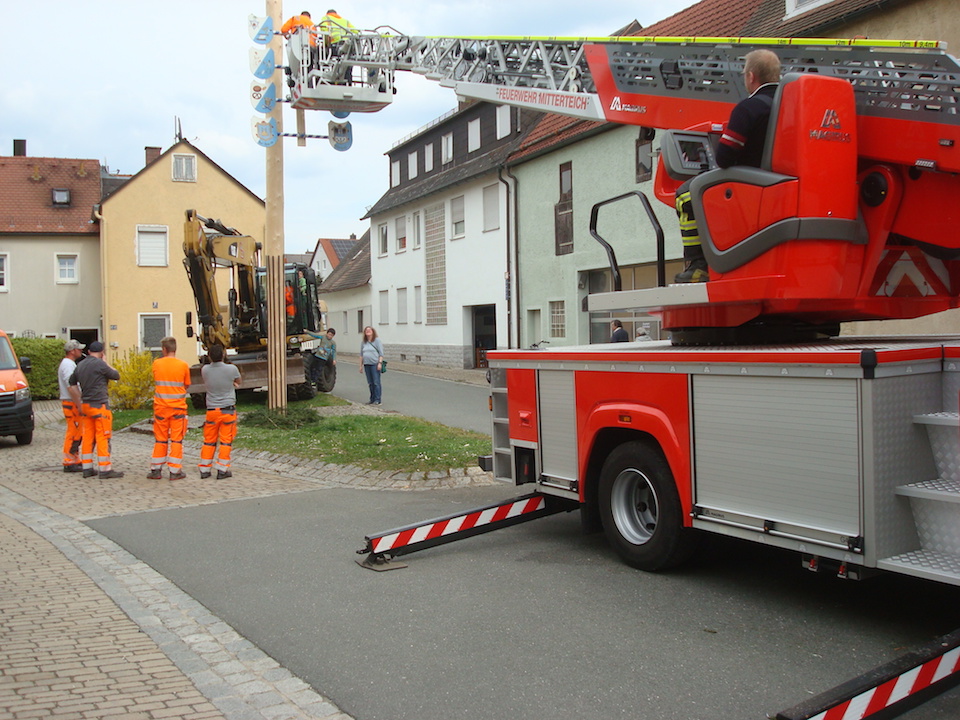 Vor Ort wurde dann am Anger das 29 Meter lange Baumstück gesäubert und geschmückt. Sieben Bauhof-Mitarbeiter waren damit mehrere Stunden beschäftigt, bis der Baum am Nachmittag aufgestellt werden konnte. Die beiden Kränze hatte Tage zuvor schon Stadtgärtner Willi Kilian mit seinen Helferinnen und Helfern vorbereitet. Um den Maibaum vor weiteren Attacken zu sichern, brachten die Arbeiter noch extra lange Eisen rund um den Baum an, damit er nicht abgesägt werden kann.