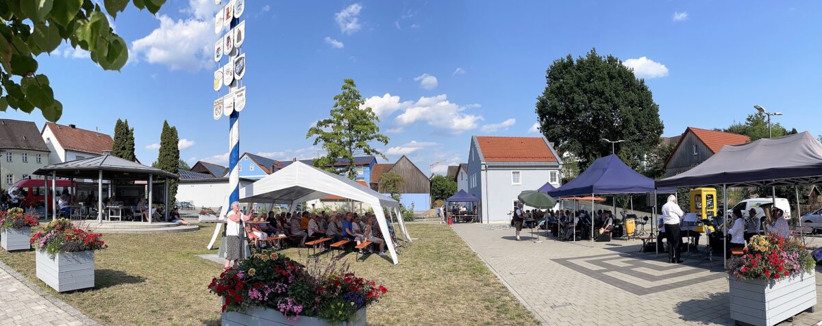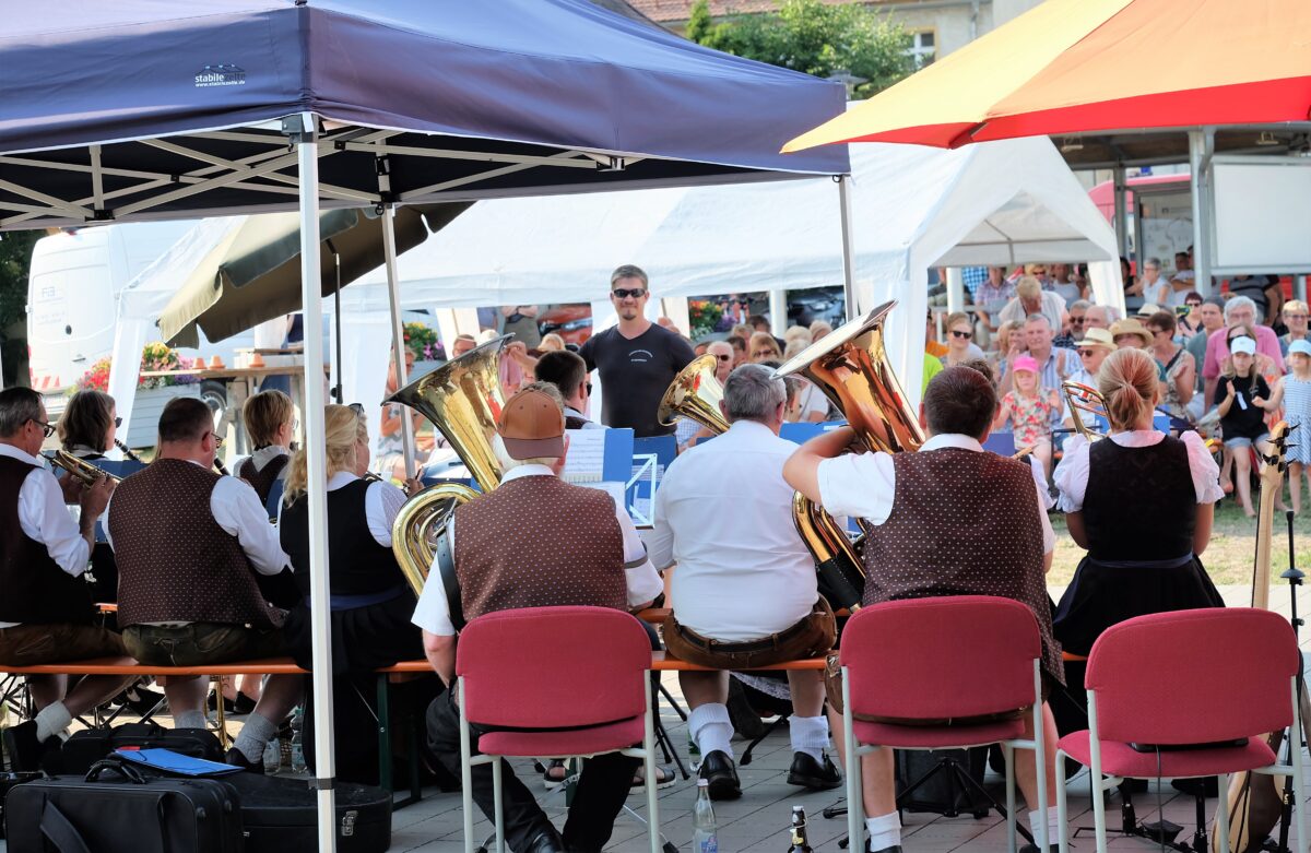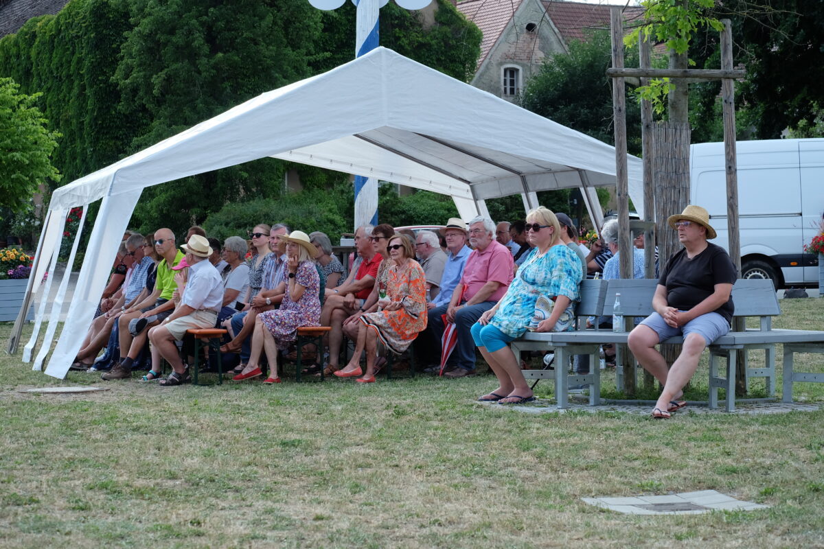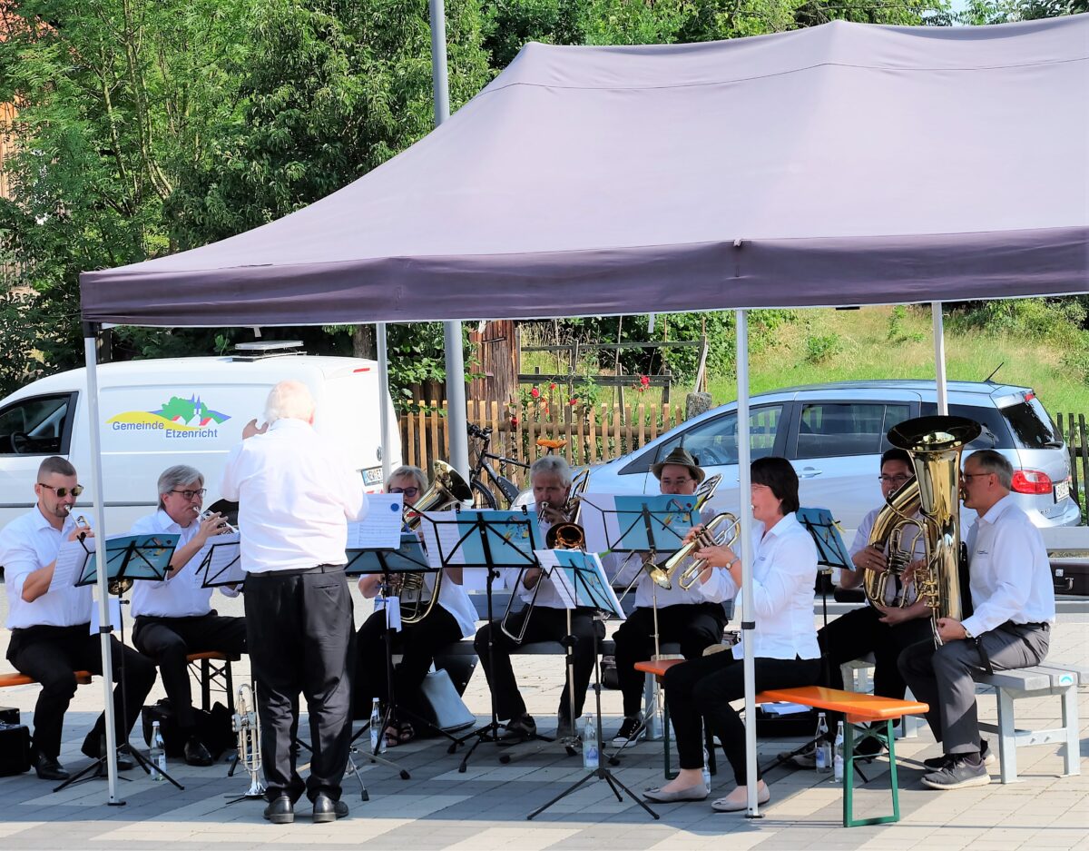 Mit dem „Schönfeld-Marsch“ begrüßte die Etzenrichter Blaskapelle, unter der Leitung von Dirigent und Vorstand Michael Erfurt die Gäste, die sich gerne unter die bereitgestellten Zelte setzten, um bei der sengenden Sonneneinstrahlung etwas geschützt zu sein.