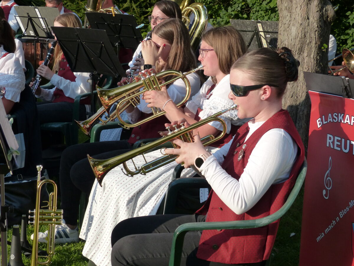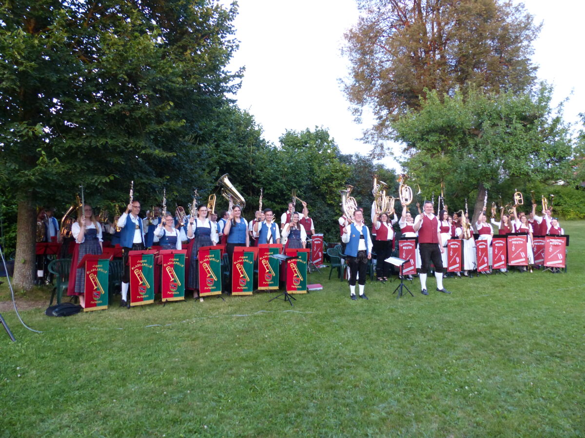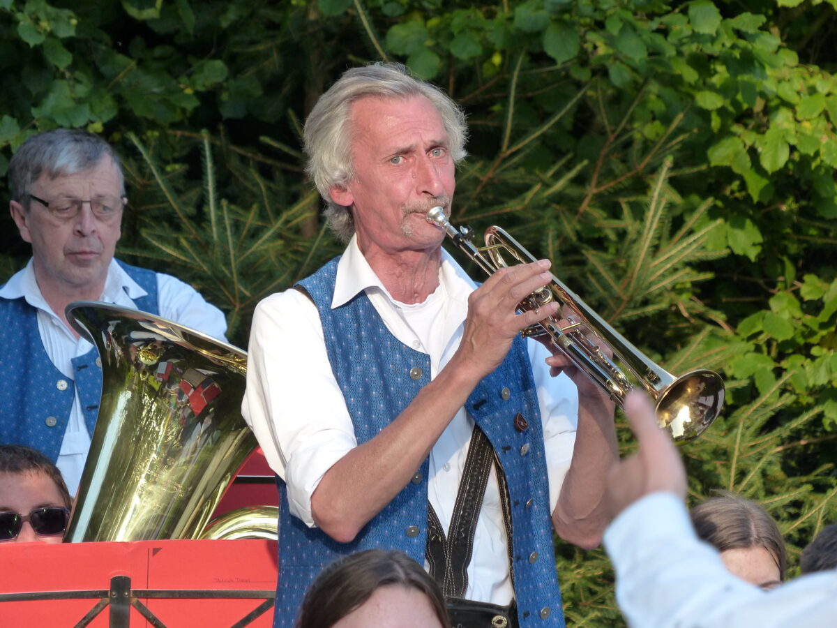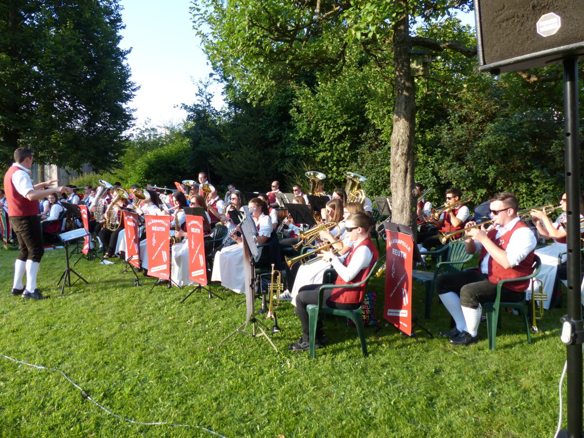 Spannend wurde es beim letzten Stück, Gabriel Schieder dirigierte, verließen die Musiker Gruppenweise ihre Sitzplätze, bis der Dirigent alleine am Pult stand. Die Reuther Musiker kehrten aber wieder zurück zu ihren Plätzen. Gemeinsam gaben die beiden Kapellen die geforderte Zugabe. Mit der Bayernhymne und den dem Deutschlandlied endete der lauschige, musikalische Abend. Marion Ermer erinnerte die Besucher an die weiteren Serenaden und lud dazu ein.