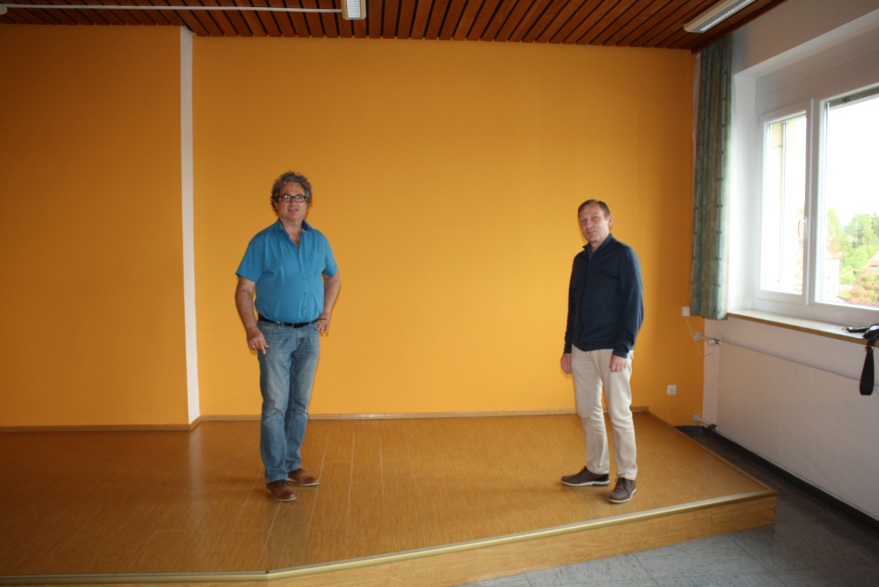 Ein 10.000 Euro Zuschuss aus dem Regionalbudget der „Integrierten Ländlichen Entwicklung (ILE) Kooperationsraum VierStädtedreieck“ zugunsten des Musikschulvereins decke etwa die Hälfte der Kosten für die Erneuerung von Decke, Elektroinstallation und Beleuchtung und einen neuen weißen Wandanstrich ab, informierte Bürgermeister Bernhard Stangl bei einem Ortstermin an der Wollauer Straße.