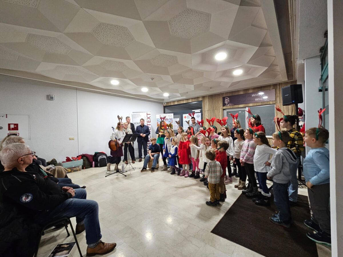 Außerdem nahm das Publikum Liedtexte wahr, darunter “From a distance”, “Ein kleines Glück”, ”Der gekaufte Drachen” und “Achtung und Respekt.” Die Mischung aus Gesang und Texten trug die adventliche Stimmung in den gefüllten Eingangsbereich.