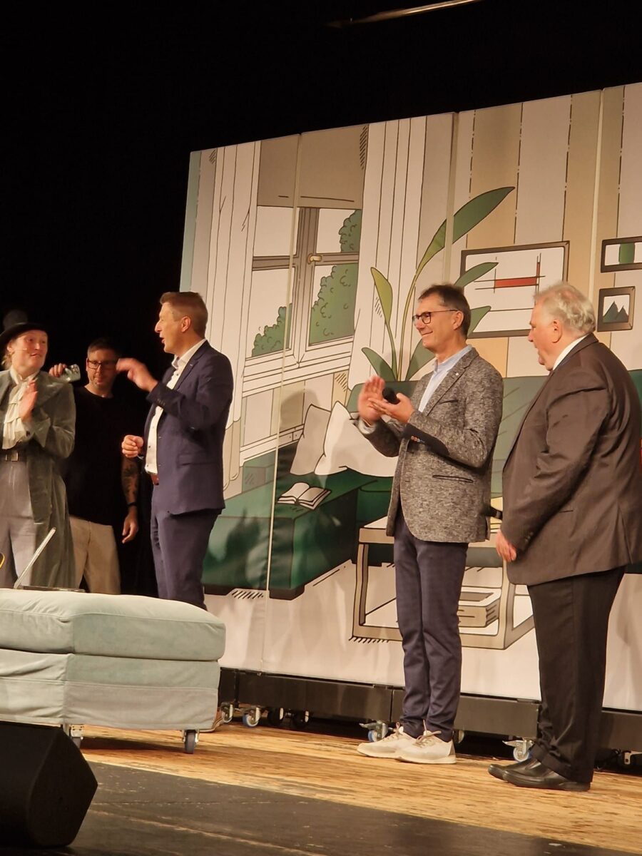 Vor dem Beginn des Theaterstücks stellten die Schauspieler auch die Gastgeber vor. Jürgen Spickenreuther als Direktor der AOK Nordoberpfalz wurde zusammen mit AOK-Beirat Franz Häring auf die Bühne geholt. Finanziert von der AOK waren die Aufführungen für die Schulen kostenlos. Auch Zweiter Bürgermeister Peter Gold sprach als Vertreter der Stadt Tirschenreuth ein kurzes Grußwort.