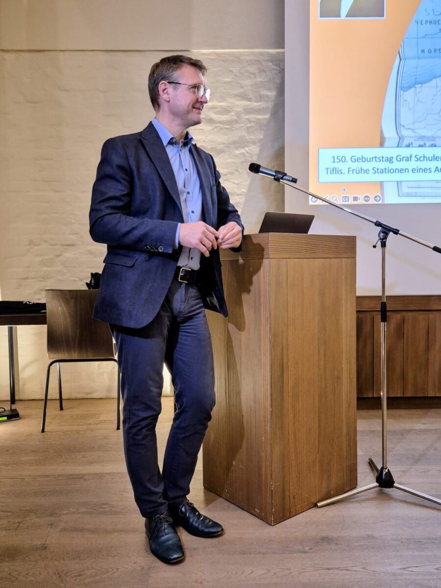 Im Mittelpunkt des diesjährigen Vortrags standen die frühen diplomatischen Jahre Schulenburgs im Kaukasus und im Osmanischen Reich, das im Ersten Weltkrieg mit Deutschland verbündet war. Prof. Piasecki beleuchtete eine bisher wenig erforschte Doppelrolle des Grafen, der unter dem Decknamen „Dr. Bergfeld“ als Agent tätig war: