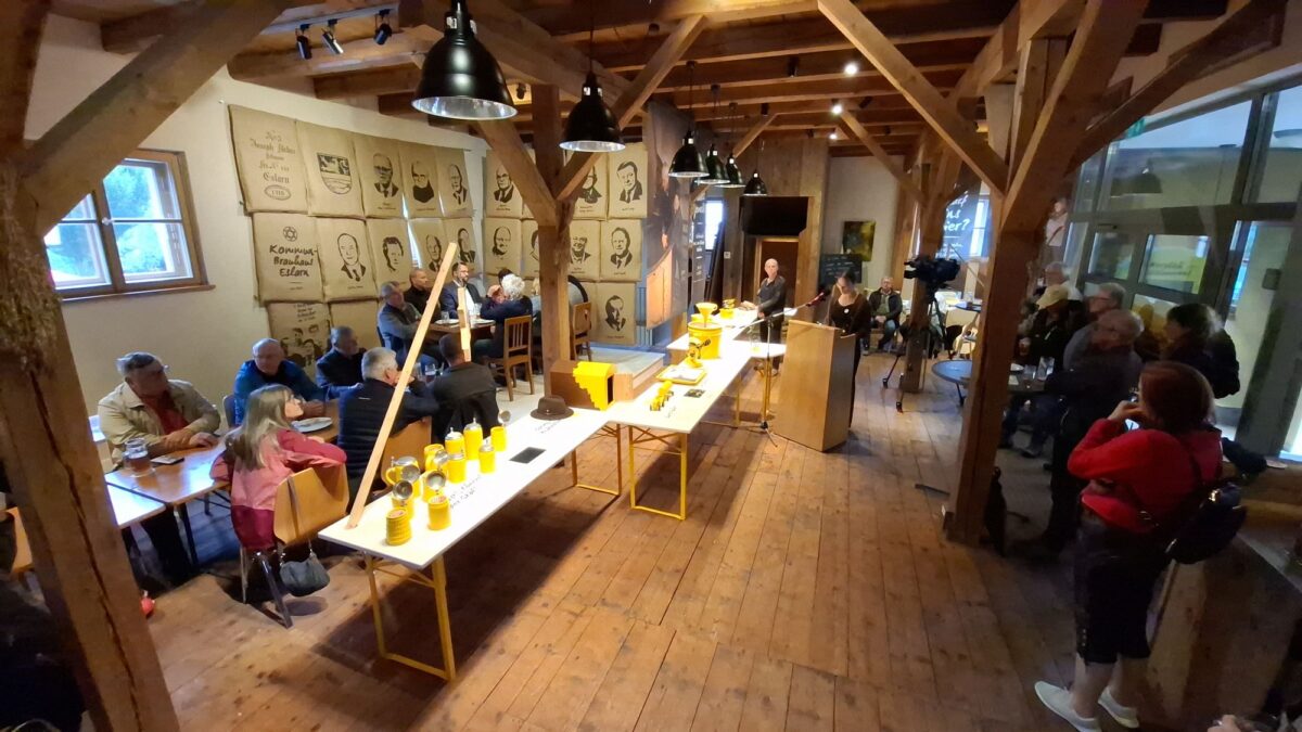 Die Zoiglkultur sichtbar machen nicht nur die gemeinsame Biertradition, sondern auch der Zoiglbrunnen vor dem Rathaus und der „Kleine Hofgarten“ am Tillyplatz. Die Gemeinde Eslarn hat zudem die Wortmarken „Kommunbier“ und „Rebhuhn-Zoigl“ beim Deutschen Patent- und Markenamt schützen lassen. Viel Applaus gab es für den anwesenden 98-jährigen Georg Zierer, der von der Gemeinde seit 1951 als Kommunbraumeister bestellt ist. Der Eslarner Bürgermeister lud zum sichtbaren Erleben der Biertradition in Wort, Bild und Ton zu einem Rundgang im „Biererlebnis“ ein. „Diese Tradition für die Zukunft zu sichern, ist mit dem Projekt Biererlebnis in einzigartiger Weise gelungen.“