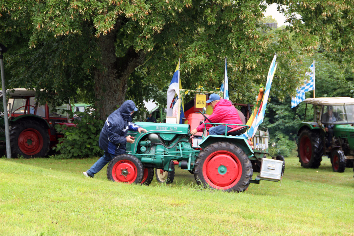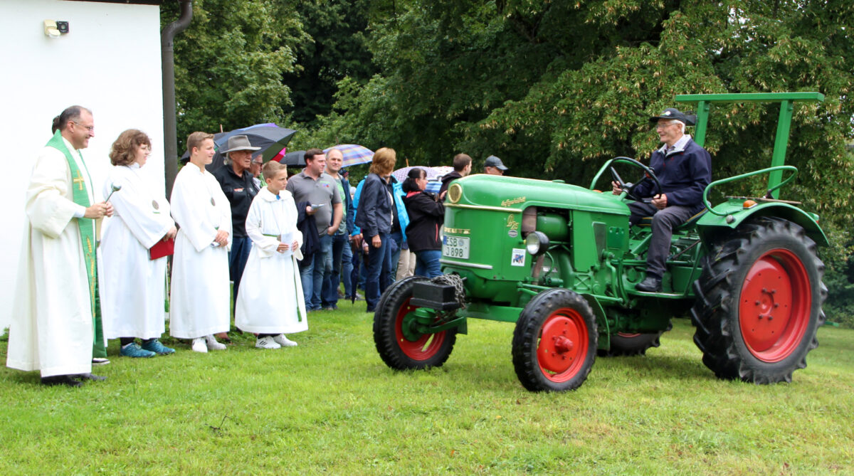 Aufgrund des schlechten Wetters wurde kurzerhand der Gottesdienst in die Bergkirche verlagert. Vor der Kirche standen dann noch Pavillons mit Bänken, die alle voll besetzt waren. Der Kirchenthumbacher Professor Dr. Hans-Georg Gradl zelebrierte den Gottesdienst. In seiner Predigt hielt Gradl einen Rückblick auf die Traktoren von einst, die damals ihre Besitzer stolz machten und eine enorme Erleichterung für die Landwirtschaft waren. Musikalisch begleitet wurde der Gottesdienst von dem „Oldtimerfreunde-Chor“.