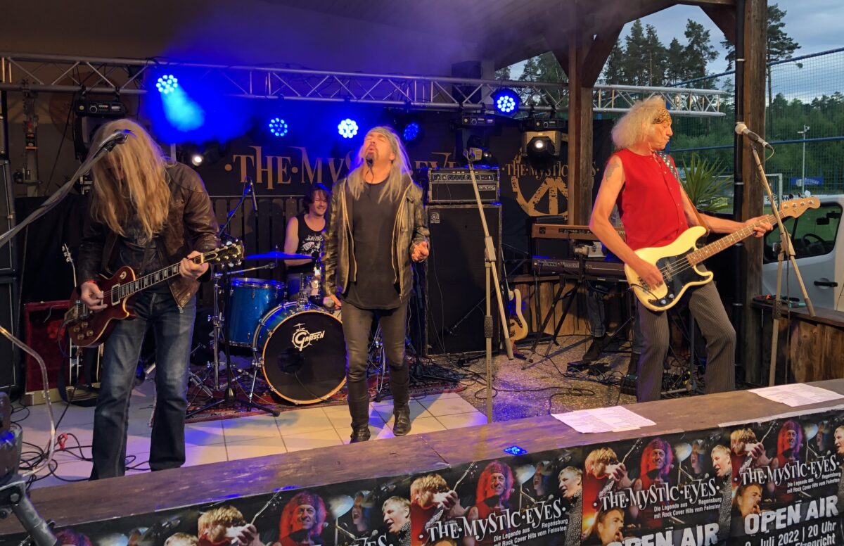 Günther V. Radny, Gründungsmitglied und Gallions-Figur der Formation, und seine voll motivierten Bandkollegen sprühten vor Spielfreude an Gitarre und Drumms. Sicherlich spielte auch die Freude über das Ende der Corona-Einschränkungen dabei eine Rolle. „Ich finde, dass das Rockspektakel phantastisch war. Ich hatte mir einiges erwartet, das wurde aber weit übertroffen“, betonte Organisator Ralf Teichmann. “Mit meiner Meinung bin ich nicht allein. Querbeet alle Besucher staunten über die tolle musikalische Qualität.“ Unter dem Motto “Was einst die Eltern schockte und die Jugend begeisterte, vereint nun die Generationen“ spielten die Rockmusiker von “The Mystic Eyes“ auf.