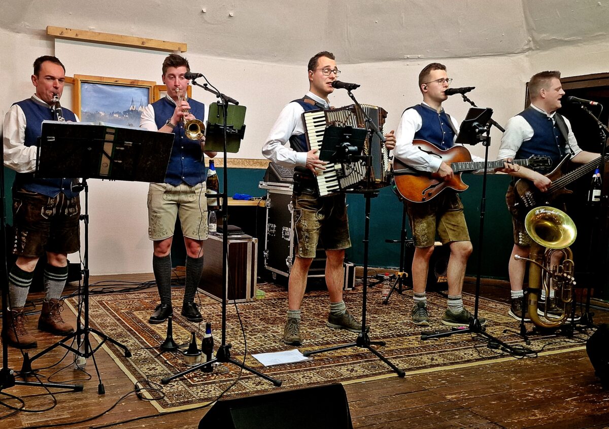 Die Gruppe „Power Hoch 5“ besteht aus Stefan Neger, Moritz Ponader, Simon Schmidt, Stefan Schmidt und Christian Koch. Ihr Credo: Musik zu 100 Prozent live zu spielen, bildete das Fundament für einen gelungenen Abend. Mit einer Mischung aus böhmischem und Oberkrainer Stil bis hin zu volkstümlicher Musik bewiesen sie ihre musikalische Vielseitigkeit. Der krönende Abschluss war das Trompetenecho, das die Gäste nicht so schnell vergessen werden.