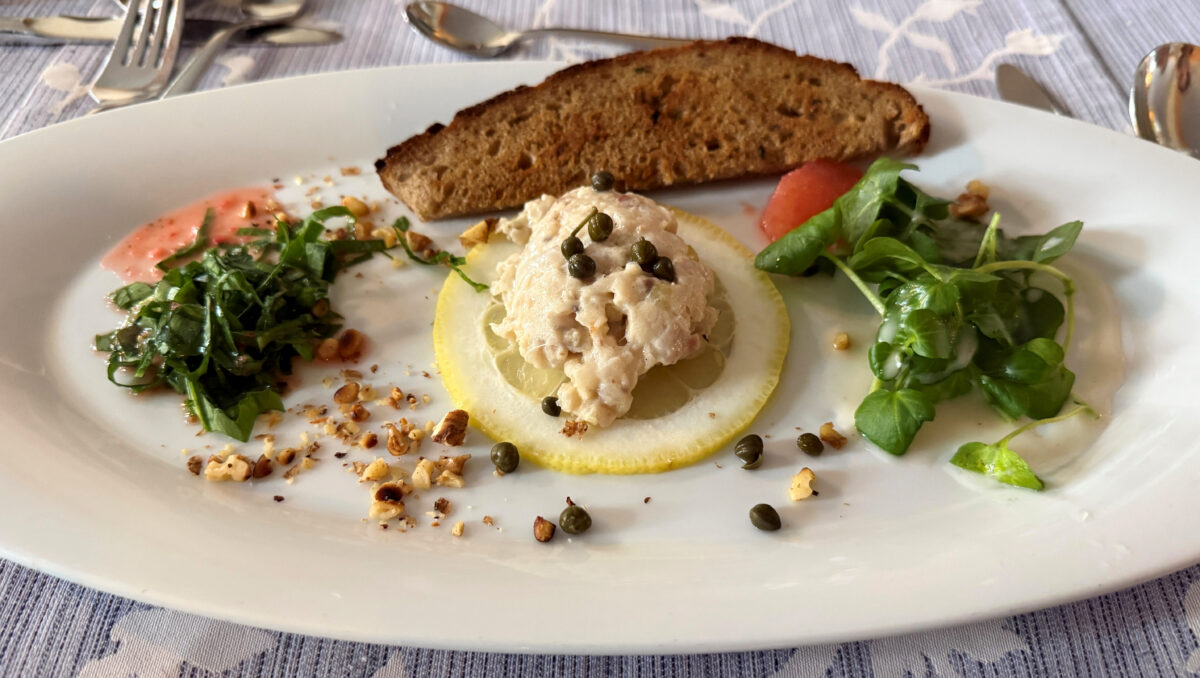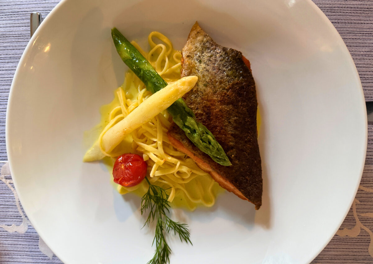 „Ich mach’ das so, weil ich so aufgewachsen bin. Wir hatten immer eine Landwirtschaft, haben daheim geschlachtet, gewurstet und gekocht. Vielen Dank für die Auszeichnung, dass das g’schätzt wird“, sprach‘s und verschwand in der Küche – um aus bodenständigen Zutaten meisterhafte Gerichte zu zaubern: Saiblingstatar mit geröstetem Brot und zweierlei fruchtig marinierten Salaten von der Brunnenkresse und Bärlauch. Stieglmühlner Fischsuppe vom Zander, die dank Noten von Ingwer und Koriander statt an den Steinwald eher an Fernostasien erinnert. Und als Hauptgang: Lachsforellenfilet und Spargel an frischen Tagliarini und Zitronensoße.