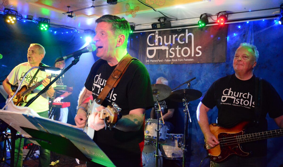 Am Freitag standen die „Church Pistols“ auf der „Live Stage“. Eine evangelische Pfarrersband, die „Faltenrock“ vom Feinsten bot. Alle Fünf: Studiert, ordiniert, installiert – mit allem, was so dazu gehört.