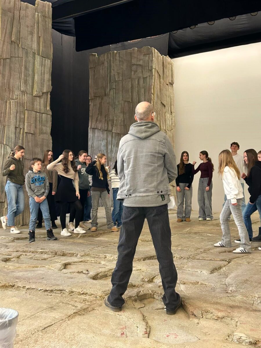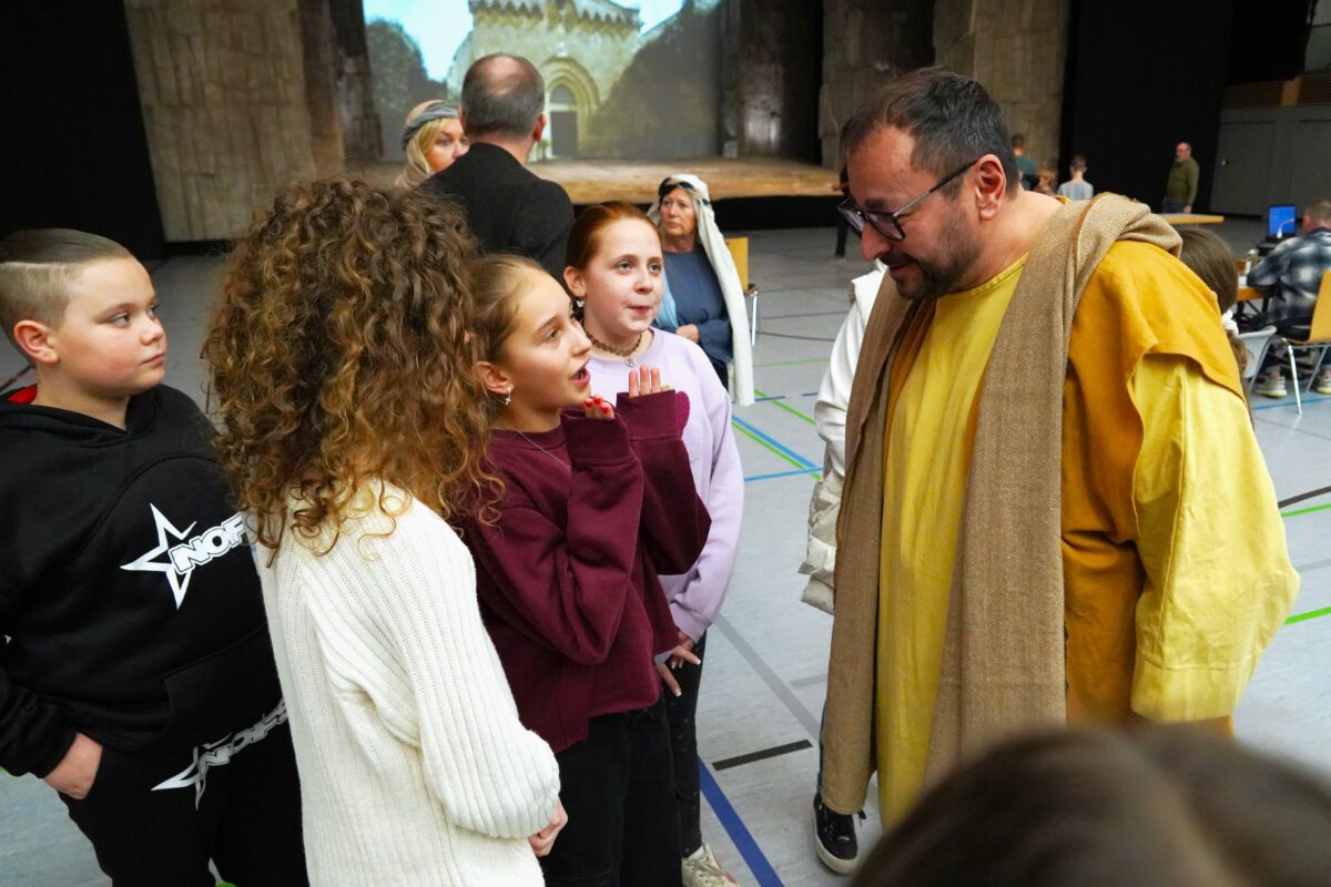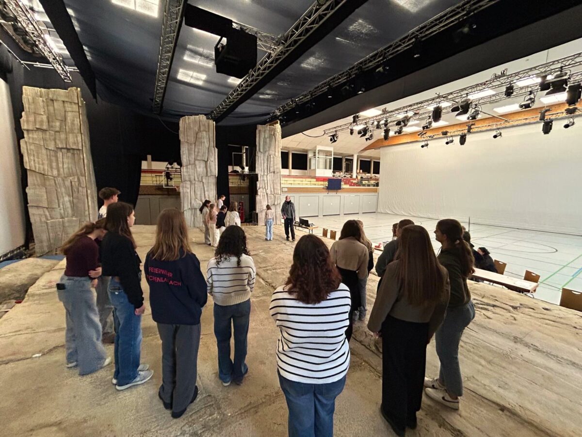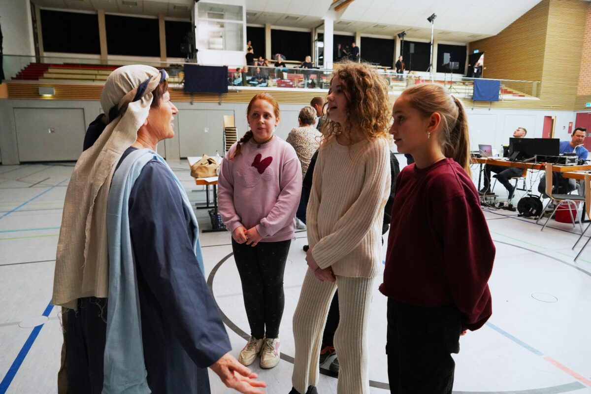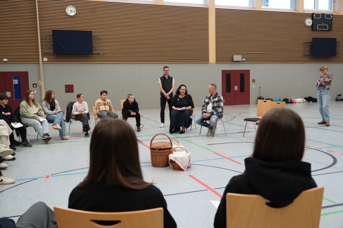 Zwei Tage nach Abschluss des Workshops durften die Schülerinnen und Schüler einer Gesamtprobe der Passion beiwohnen. Regisseur Thomas Linkel trat der Gruppe bei, beantwortete geduldig alle Fragen und teilte seine Erfahrungen und Einblicke in die Passion mit. „Dabei entschieden sich zwei Schüler sowie ein interessierter Vater spontan für ein Mitwirken bei der Passion“, sie wurden sofort in die Aufführung integriert.