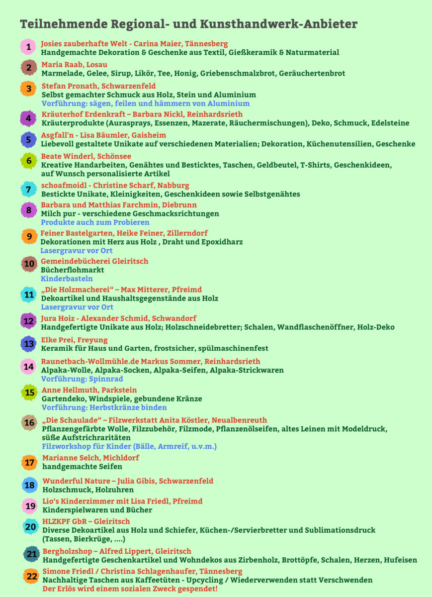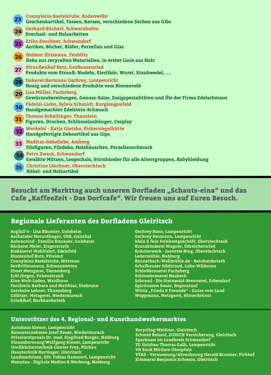 Der Dorfladen Gleiritsch veranstaltet den Markt. Das Angebot stärkt regionale Produzenten und macht traditionelles Handwerk sichtbar. Familienfreundliche Aktionen erhöhen die Aufenthaltsqualität auf dem Dorfplatz.