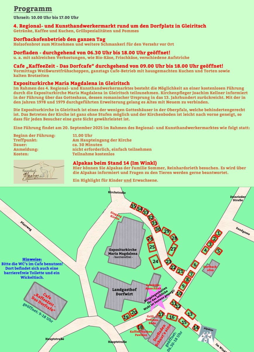 Eine kostenlose Führung durch die Expositurkirche Maria Magdalena in Gleiritsch beginnt um 11 Uhr am Haupteingang und dauert etwa 30 Minuten. Familien besuchen am Stand 14 die Alpakas der Familie Sommer und erleben die Tiere aus nächster Nähe.