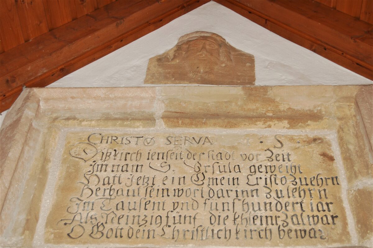 Christo servat diß Kirch/jenseit der Stadt vor zeit / In Nam S. Ursula geweiht! – Hatt jetzt ein Gmein Christo zu ehrn / herbaut, sein wort darinn zu lehrn / im Tausent und fünfhundertiar, / als neinzigfünf die khleinr zal war. / O Gott, dein Christlich kirch bewar.