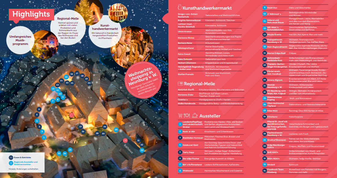 Über 50 Aussteller aus der Region präsentieren an allen drei Tagen Kunsthandwerk, Direktvermarktung und weihnachtliche Angebote. Zwei Bühnen tragen das Musikprogramm durch das Wochenende; dazu heißt es: “Mit weihnachtlicher Blasmusik, Christmas-Rock, mehreren Chören und vielen mehr ist das gesamte Wochenende über auf zwei Bühnen für ein tolles Live-Musik-Programm gesorgt.”