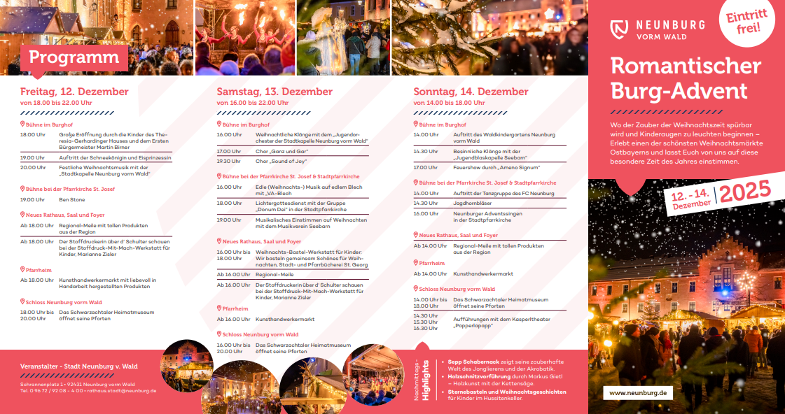 Neunburg vorm Wald richtet am dritten Adventswochenende den Romantischen Burg-Advent aus. Vom 12. bis 14. Dezember 2025 verwandeln der Burghof und das historische Areal “Im Berg” die Altstadt in ein stimmungsvolles Marktgelände. Der Eintritt ist frei und Gäste erleben drei Tage lang ein vielfältiges Angebot aus der Region.