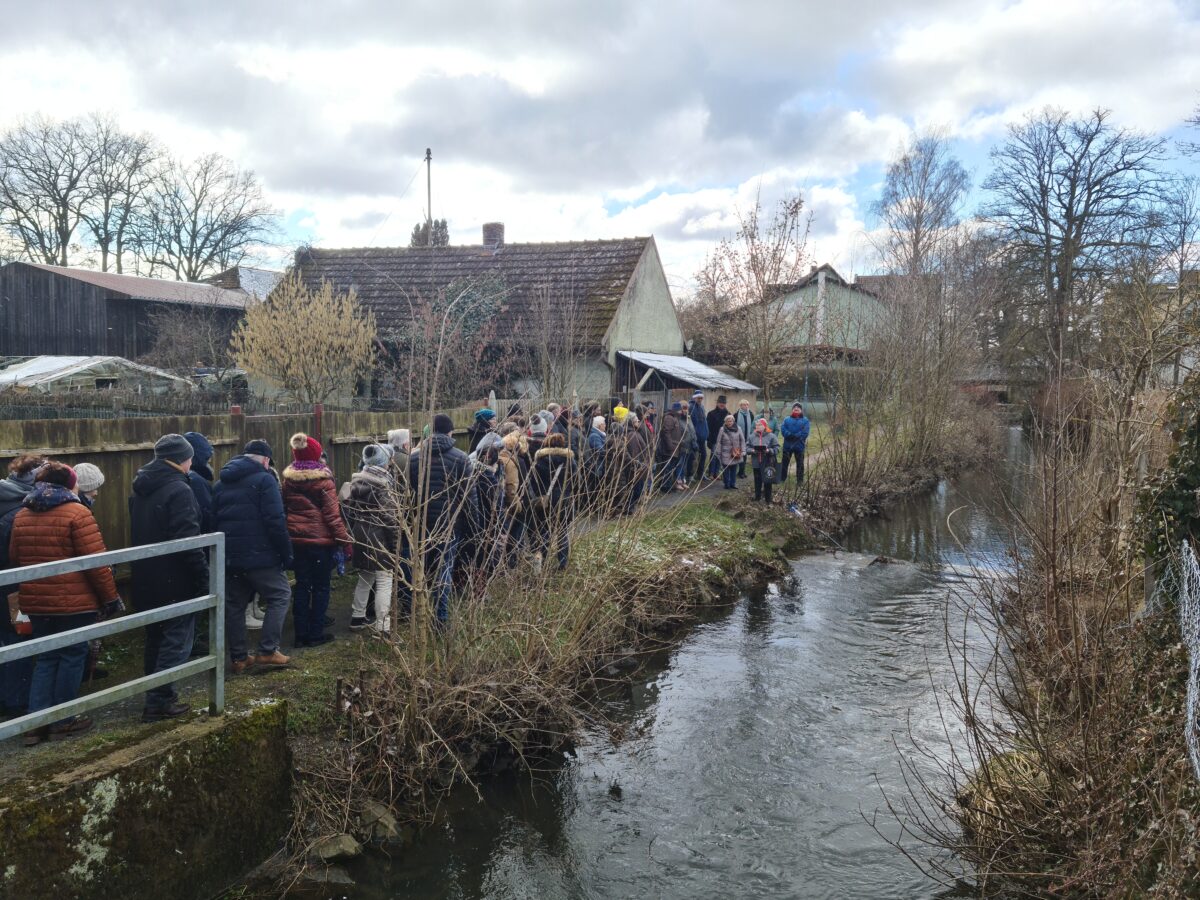 Idyllisch liegt der Kirchensteig an der Thumbach, da wurden die beiden Gästeführerinnen fast nostalgisch und erinnerten sich an die Kindheit zurück: “Erst abends kehrte man verschmutzt, mit roten Backen und ausgepowert aber glücklich nach Hause zurück. Die Natur selbst war das spannendste Spiel.”