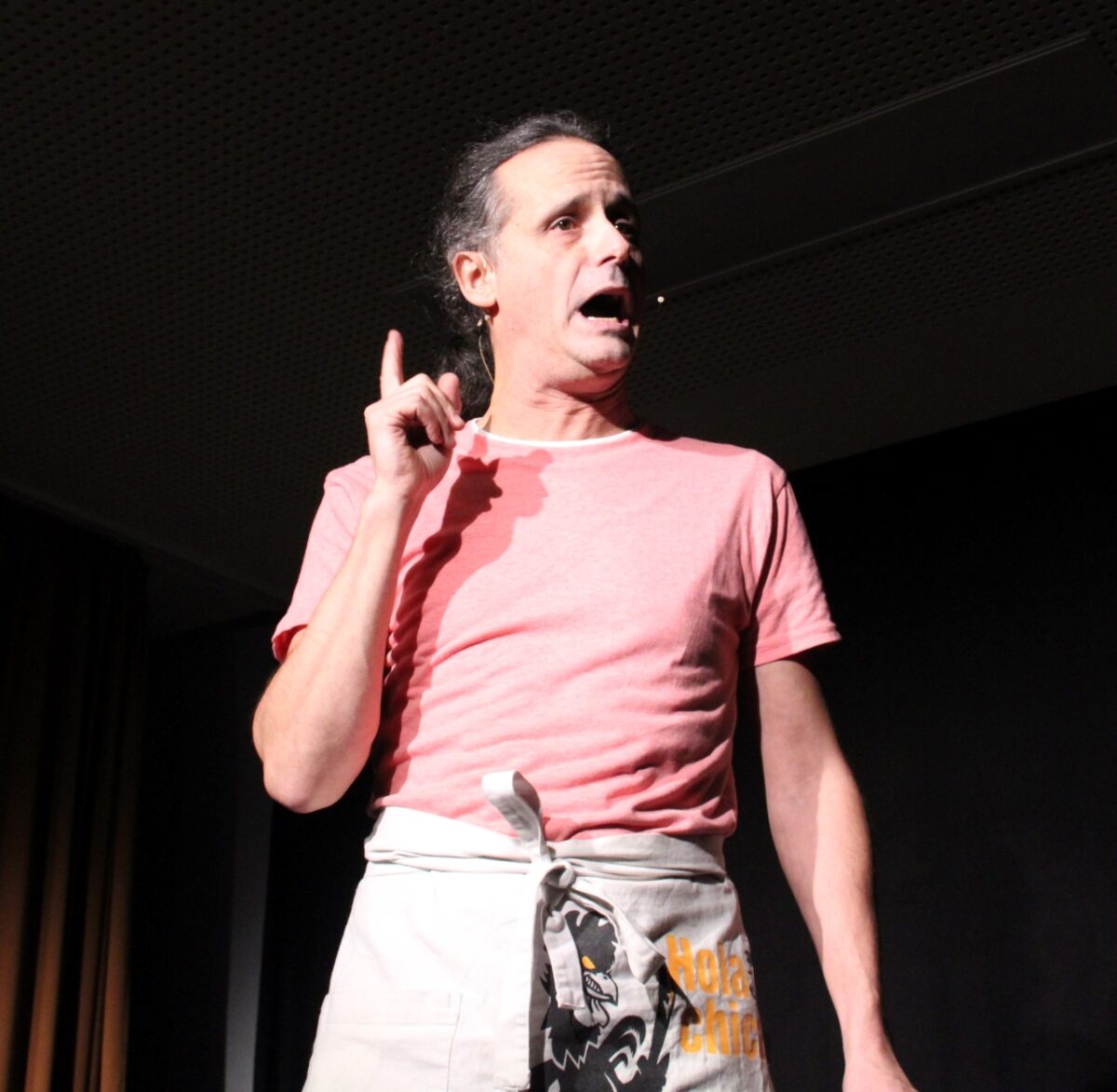 In seiner imaginären Slow-Food-Gruppe nimmt er Ernährungsmethoden ebenso auf die Schippe wie Essgewohnheiten und Nahrungsangebote. Muss es das klassisch teutonische Kraftfutter Eisbein in Pralinenform geben oder kalten Reis in rohem Fisch unbedingt essen?