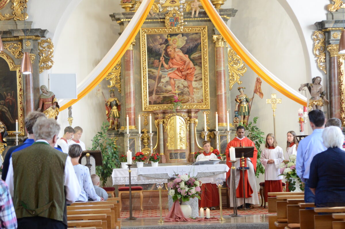 Mit einem kleinen Kirchenzug mit der durch drei Fahnen sichtbaren Beteiligung örtlicher Vereine und der Führungsspitze der Gemeinde Georgenberg wurde das Patrozinium eröffnet. In der Einleitung zum Festgottesdienst sprach der Geistliche über den Heiligen Christopherus, der im Dienst an den Kleinen und Hilfsbedürftigen den Größten, nämlich Christus, gefunden habe.