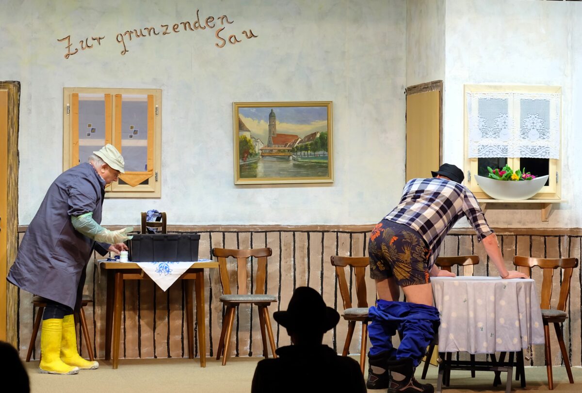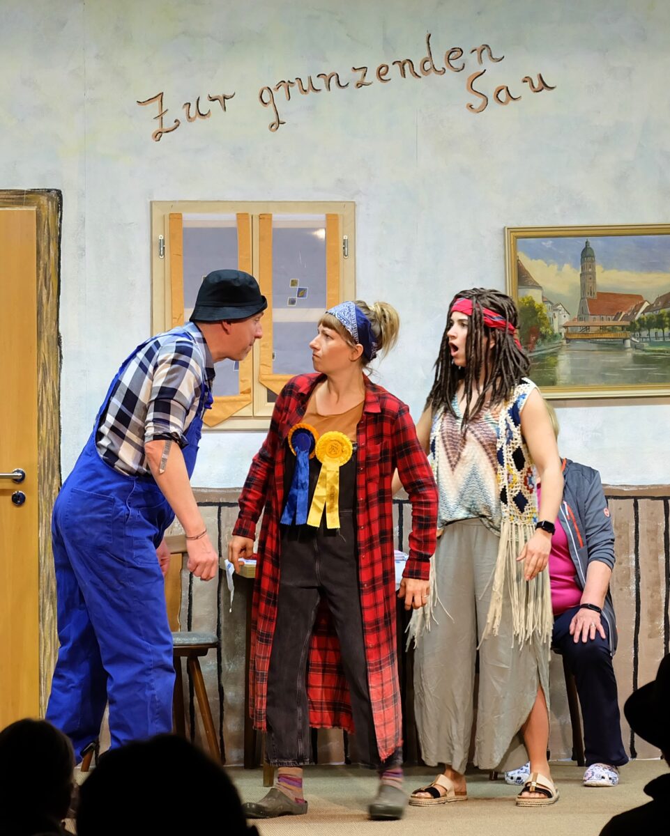 Es war ein hartes Training für die Lachmuskulatur, das die Etzenrichter Laienspieler den Besuchern verordnet hatten. Mit dem Dreiakter „Schweinekram und Biowahn“ zogen sie alle Register ihres schauspielerischen Könnens und erhielten dafür am Ende reichlich Applaus. Bei vier ausverkauften Vorstellungen auf der Bühne im Untersaal der katholischen Kirche, durften sich die Besucher auf ein turbulente Lustspiel freuen.