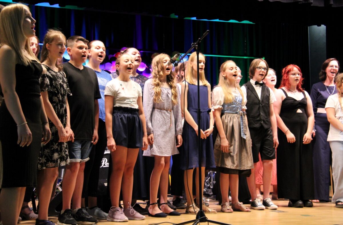 Großen Applaus erhielt der einzige Solist des Abends, der Sänger Stefan Bäuml, für Andreas Bouranis „Auf uns“. Der Schulchor wurde erstmals bei „All I have to do is dream“ vom Lehrerchor ergänzt. Die elf Pädagoginnen glänzten auch bei „I’m still standing“ von Elton John. Zwei Tanzgruppen zeigten zu fetzigen Melodien ihre Tänze mit teils akrobatischen Elementen. Voll wurde die Bühne und der Bereich davor, als ein Chor bestehend aus vier Klassen (5a/d, 6a/d) eine Hymne an den Bayerischen Wald sang.