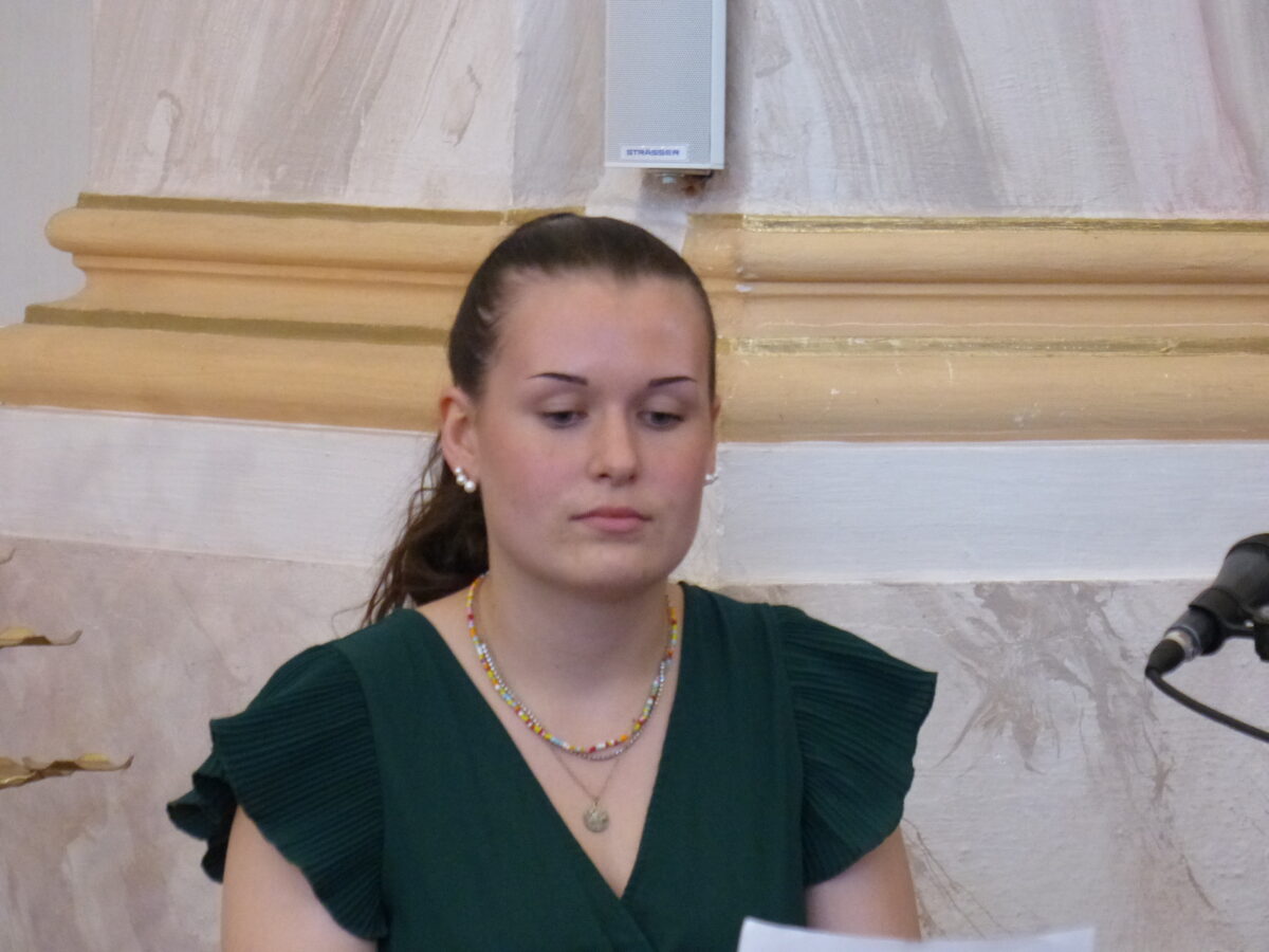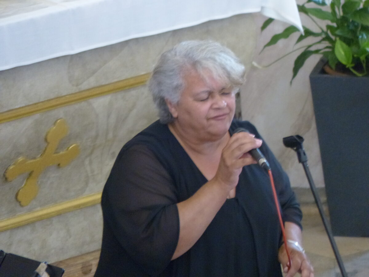 Ramona Fink, bekannt vom Gospel-Chor „Hope and Joy“, brachte ihre sehr markante Stimme beim Lied „Wo ich auch gehe, du bist schon da“ voll zur Geltung, begleitet wurde sie von Max Braun am Piano. Bevor die Künstlerin mit dem Stück „The Lord is May light“ nochmals glänzte, trat der Projektor mit „Frieden wünsch ich Dir“ nochmals in Aktion.