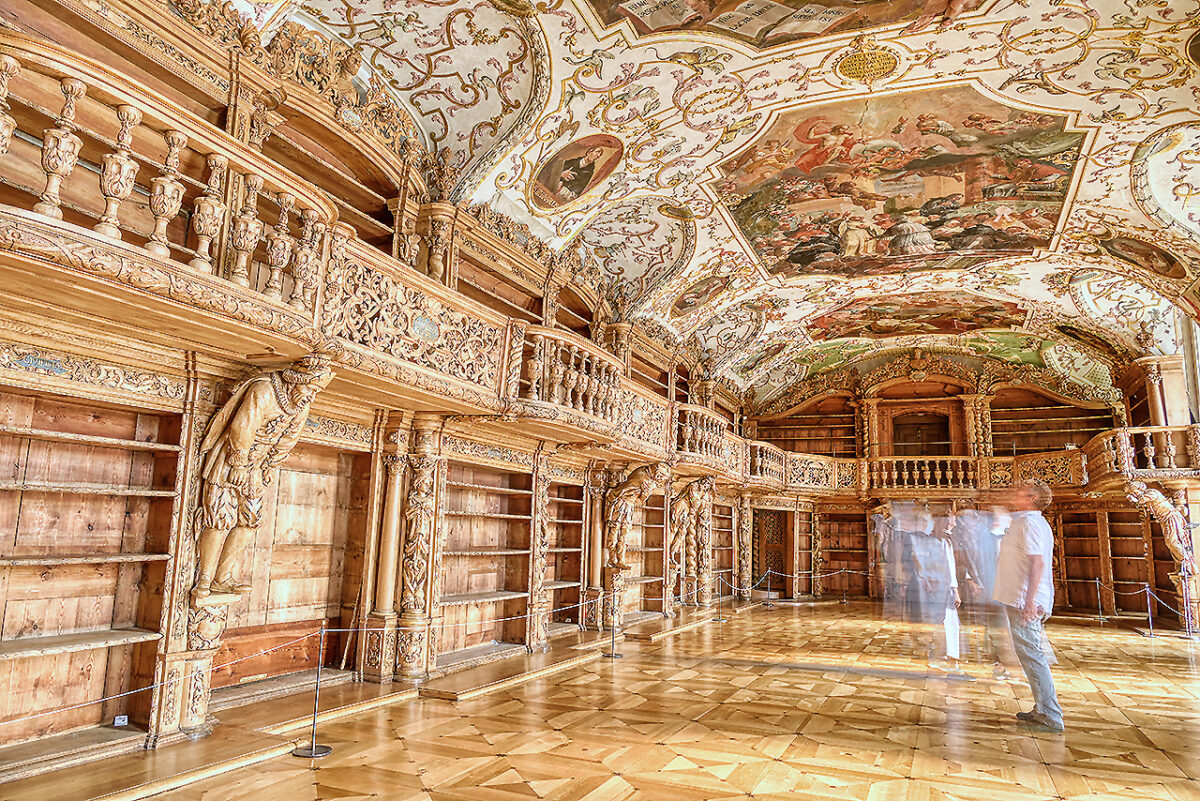 Und dann, als kunsthistorisches Highlight, darf natürlich auch die Klosterbibliothek nicht fehlen – auch wenn die barocken Regale derzeit ihre Bücher vermissen, die vorübergehend in München gelagert sind.