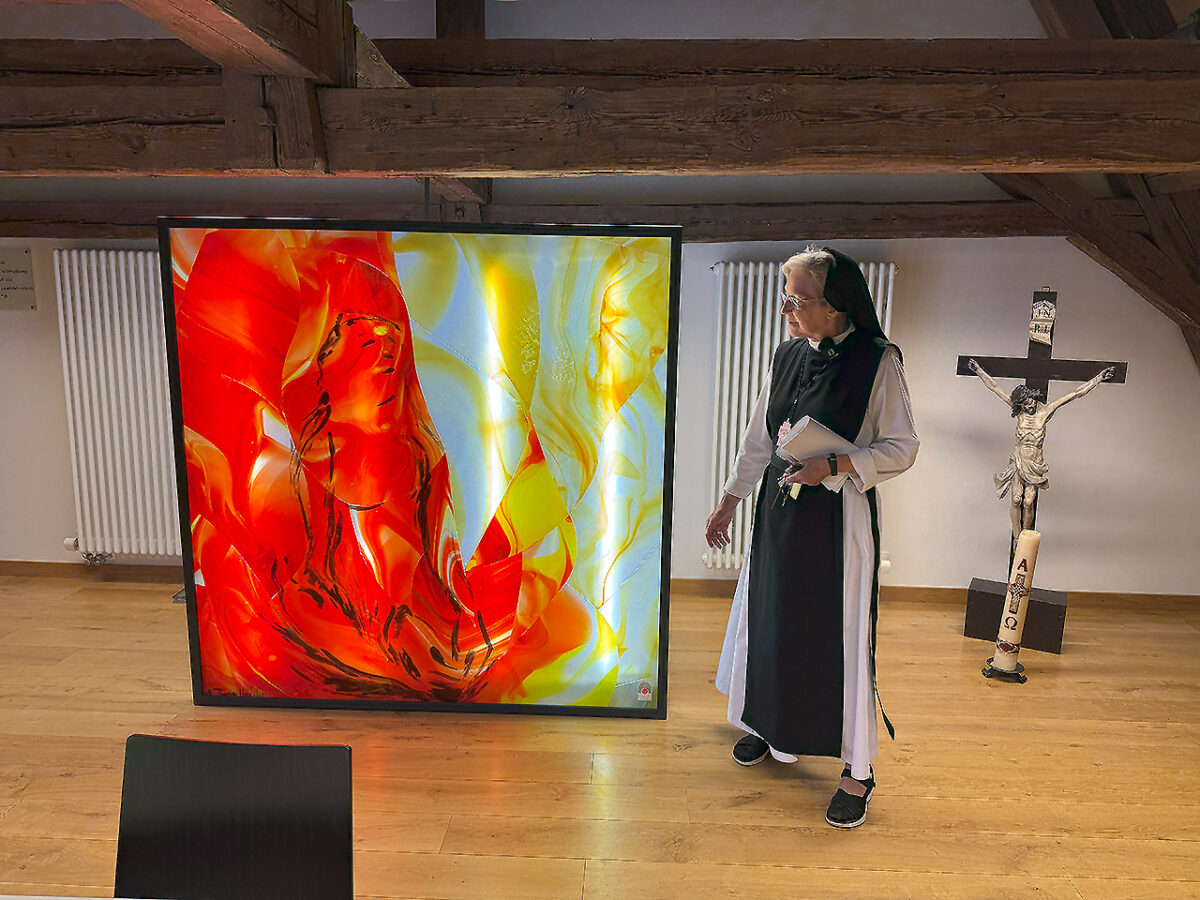 Anschließend besuchen wir gemeinsam die Klosterkirche Mariae Himmelfahrt, die 1924 eingeweiht und 2009 generalsaniert wurde: mit reduzierter Architektur, dem Altarraum auf Augenhöhe mit dem Kirchenvolk und einem schlichten, eigens für sie gestalteten Äbtissinnenstab aus französischem Nussbaumholz – Symbol der Hirtensorge, nicht der Hierarchie.