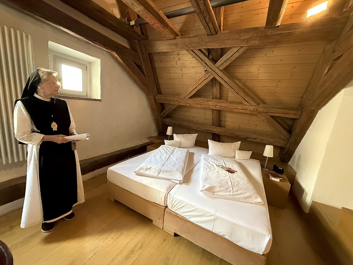 Dann skizziert sie den Weg, den wir gemeinsam gehen werden: „Zuerst besuchen wir das Gästehaus St. Joseph – das war unsere wirtschaftliche Rettung und ist heute ein Ort der Gastfreundschaft, wie sie schon Benedikt vor 1500 Jahren beschrieben hat.“ Über 40 Jahre lang habe das Gebäude leer gestanden, dann sei es 2008 eröffnet worden: Ein Dialog der Jahrhunderte aus mittelalterlicher Bausubstanz, Barock und moderner Architektur – und vor allem ein Ort der Begegnung.