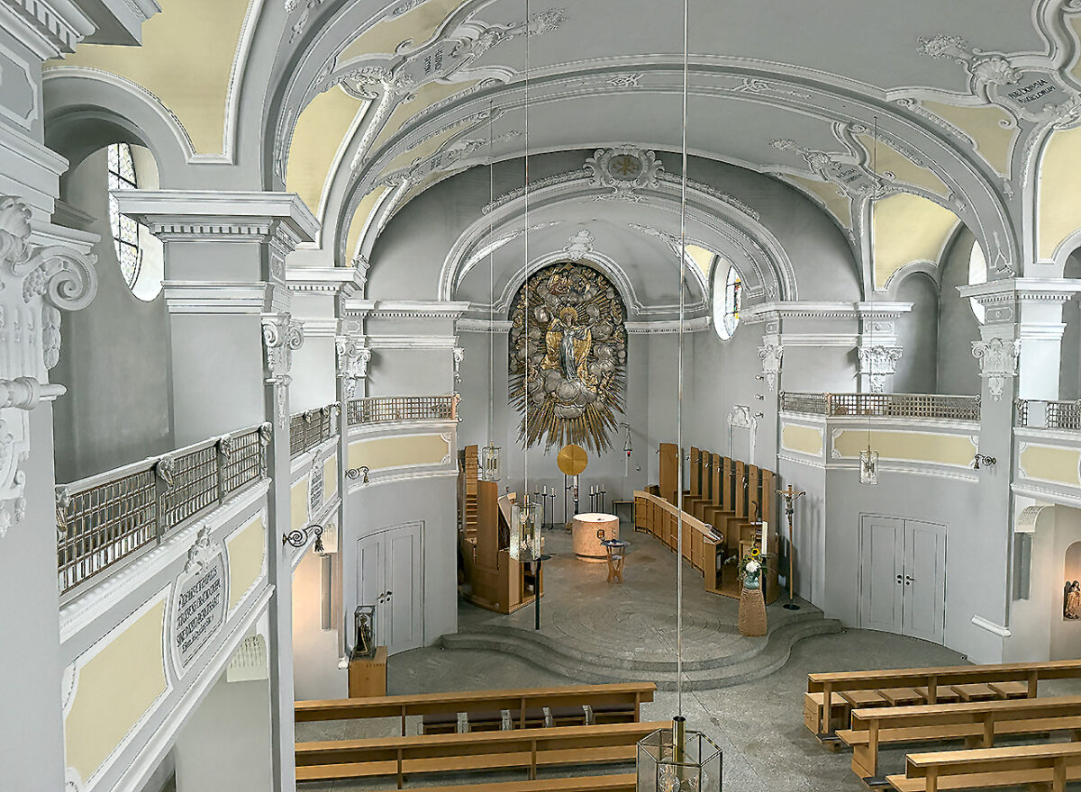 Noch ehe der erste Schritt in den Hauptschiffraum getan ist, bleibt der Blick auf der Empore hängen. Von hier oben entfaltet sich der nüchterne, klare Neubarock der 1924 eingeweihten Klosterkirche Mariae Himmelfahrt. Kein Vergleich zur opulent ausgeschmückten Basilika nebenan – stattdessen: Struktur, Raum, Gebet. „Früher führte der Hochaltar sieben Stufen nach oben bis unter die Wolke“, erinnert sich Äbtissin Laetitia. „Wir haben ihn abgetragen – auf zwei. Wir beten jetzt mit dem Volk.“ Statt liturgischer Erhabenheit: Augenhöhe. Statt barocker Repräsentation: spirituelle Nähe.