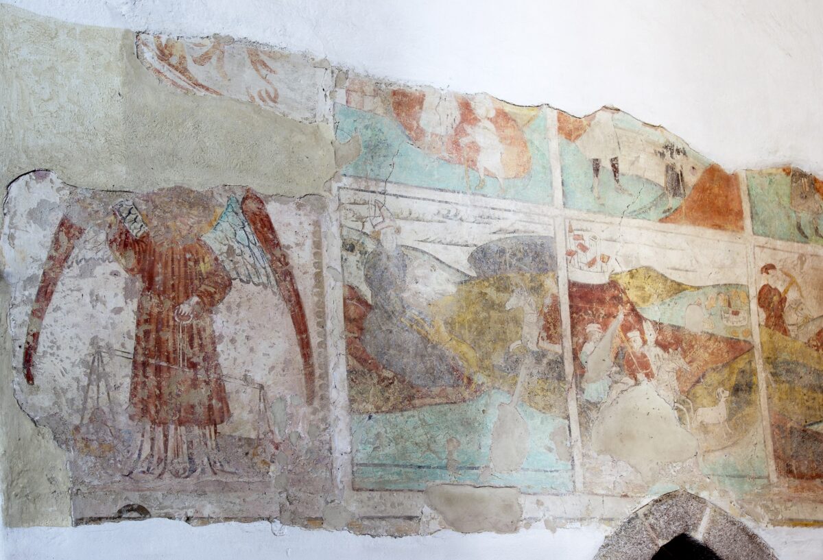 In der zweiten Hälfte des 20. Jahrhunderts legte man sie teilweise wieder frei. Auf ihnen sind unter anderem Szenen aus dem Leben des Hl. Ägidius dargestellt, dem ursprünglichen Patron der Kirche. Erst in der zweiten Hälfte des 17. Jahrhunderts widmete man sie um, zugunsten Johannes des Täufers. Der Taufstein unter der Empore stammt aus dem 13. oder 14. Jahrhundert. Der stimmig dazu passende Deckel wurde im 20. Jahrhundert angefertigt.