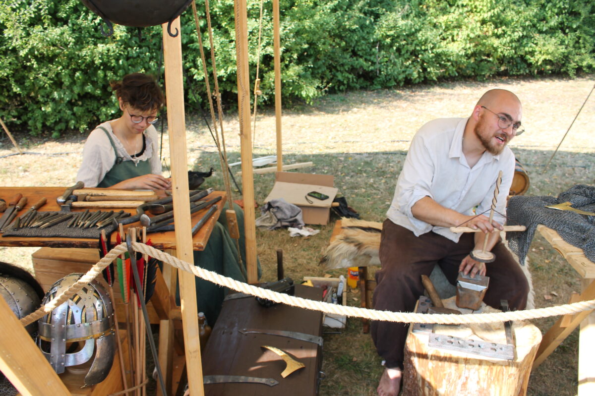 Mit Schweiß, Kraft und Findigkeit. Ruhe, Kraft und Geduld sind fraglos auch unabdingbar für einen „Sarwirker“ (Kettenhemdschmied) oder „Plattner“ (Rüstungsschmied): Das weiß niemand besser als Raphael Schmidt aus Selb, der gemeinsam mit Tanja Hollmann am „Tailors of Steel“-Stand vorführte, wie man im Mittelalter „mit viel Schweiß und Kraft“ Kettenhemden und Ritterrüstungen fertigte. Etwa ein Jahr Arbeit stecke in einem Kettenhemd, sofern man es traditionsgetreu in reiner Handarbeit herstelle. Für eine handgefertigte Ritterrüstung brauche es sogar bis zu zwei Jahre, ein Helm könne bereits nach einem Monat fertig sein.