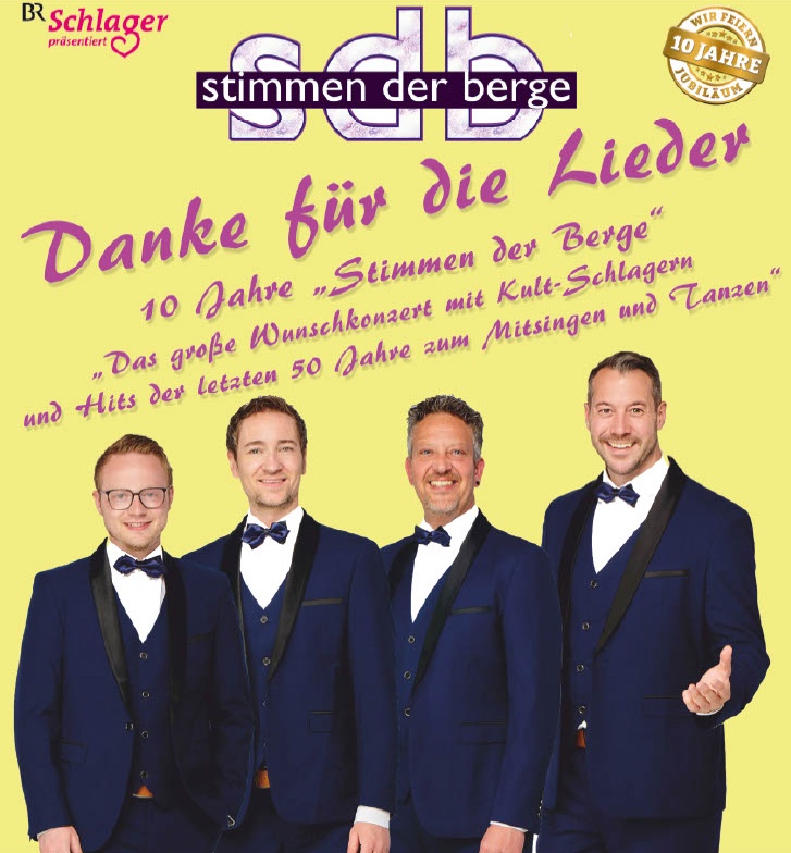Das Jubiläum feiern die STIMMEN DER BERGE auch in Bayern – mit einer großen Tournee. Zum Bühnenjubiläum unter dem Motto „Danke für die Lieder“ werden die beliebten Künstler ihrem Publikum ein großes Wunschkonzert mit Kult-Schlagern aus den letzten 50 Jahren sowie ihren eigenen großen Hits zum Mitsingen bieten. Präsentiert werden die Termine in Bayern von BR Schlager. Alle Informationen und Tickets gibt es auf www.stimmenderberge.com.