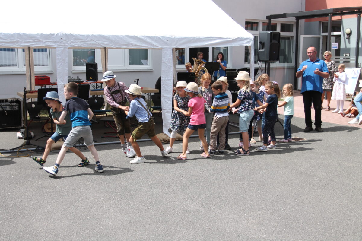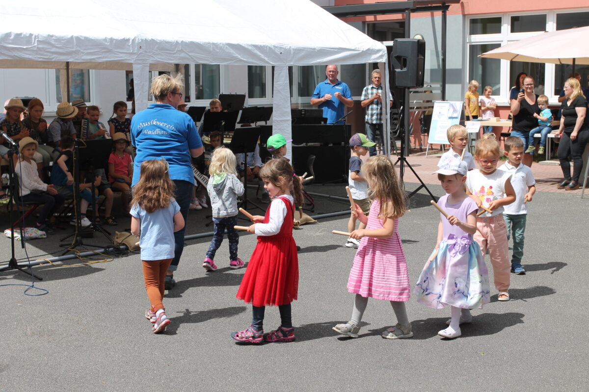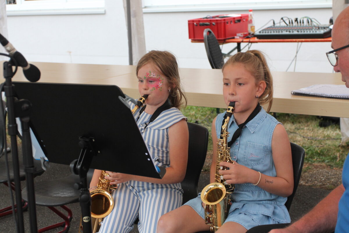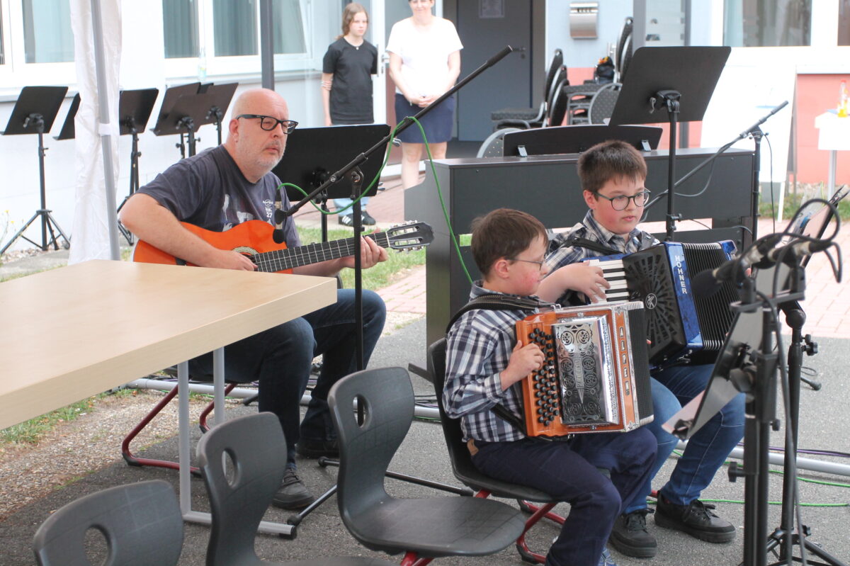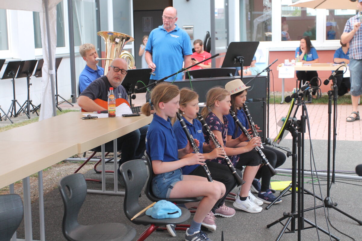 Die vielen Besucher konnten sich im Schulhof wieder einmal live überzeugen. Nicht nur Vorsitzender Simone Dietl stand die Freude ins Gesicht geschrieben, sondern auch dem musikalischen Leiter Hermann Mack und allen Lehrkräften. Ob die Kinder der Grundkurse eins und zwei, Solisten am Klavier – auch mit Gesang – und der Steirischen Harmonika oder Nachwuchsmusiker mit ihren Flöten, Saxophonen und Klarinetten: Sie zeigten keinerlei Lampenfieber und freuten sich über den Beifall der Gäste.