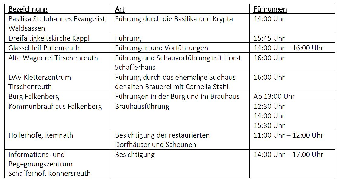 Die Basilika St. Johannes Evangelist in Waldsassen mit ihrer beeindruckenden Krypta und die Dreifaltigkeitskirche Kappl sind nur einige der Highlights des Tages. Die Burg Falkenberg und die traditionsreiche Glasschleif in Pullenreuth laden ebenfalls zu einem Besuch ein. Neben diesen Stationen bieten die Führungen in der Alten Wagnerei Tirschenreuth oder im Kommunbrauhaus Falkenberg lebendige Einblicke in vergangene Handwerkstechniken. In Kemnath können Besucher die restaurierten Dorfhäuser und Scheunen der Hollerhöfe bestaunen, während das Informations- und Begegnungszentrum Schafferhof in Konnersreuth seine Pforten öffnet. Das DAV Kletterzentrum Tirschenreuth gewährt Interessierten einen Blick in das ehemalige Sudhaus der alten Brauerei.