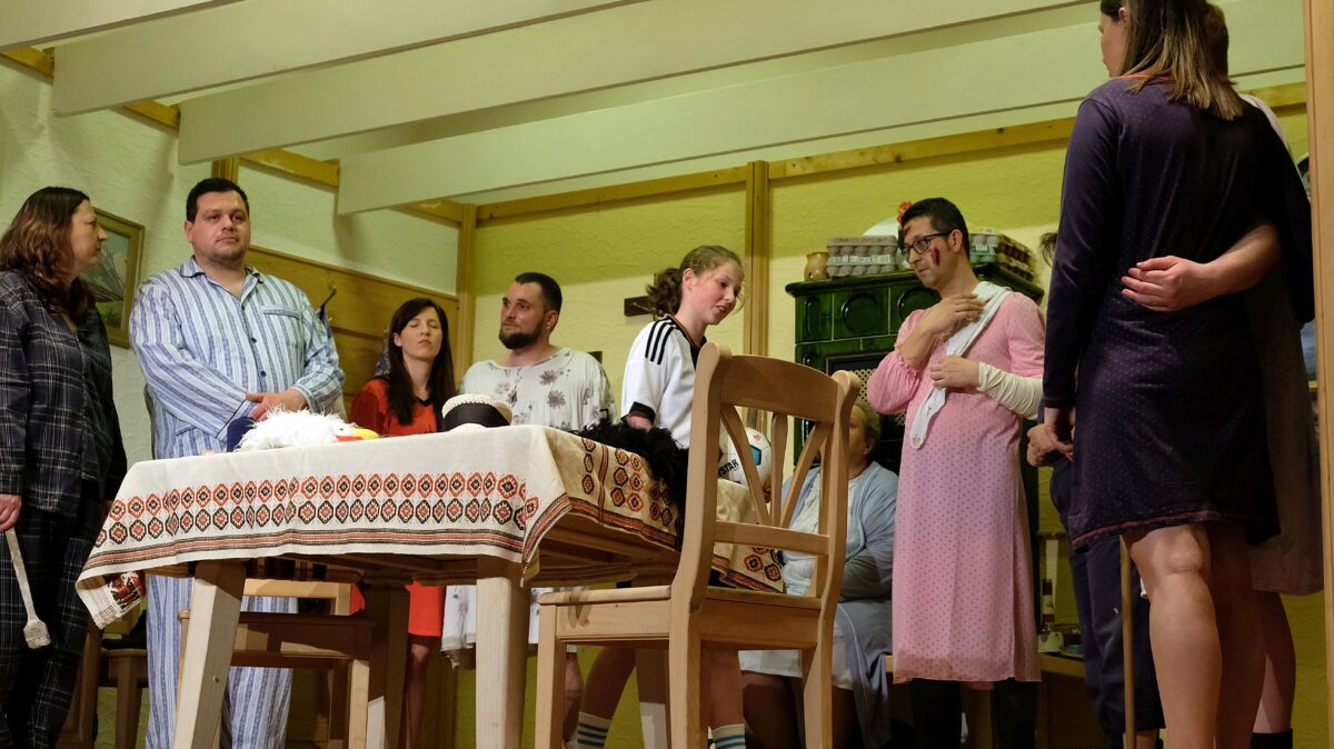 Die gab es auch heuer wieder, jedoch nicht mit Leonie, denn sie bekam von ihrem Opa eine extra Rolle für den ersten und dritten Akt geschneidert. Leonie wusste natürlich schon früher, dass Opa Theater spielt, aber da war sie zu jung. Das war auch noch vor Corona, da war sie gerade mal sieben Jahre. Natürlich hat sie ja einige Gene von ihrem Opa eingesetzt. Eingebunden wird Leoni in den 1. Akt als aktive Fußballspielerin, denn sie schießt mit dem Ball eine Fensterscheibe im Hühnerstall ein, bekommt dadurch so das eine oder andere mit, wie es in dem Haushalt „zugeht“. Friedas Übernachtungszuordnung macht zunächst alle geheimen Sehnsüchte zunichte. Doch die Paare wissen, wie sie es schaffen können, Frieda zu umgehen. „Oh Elend, oh Not“, sie scheint ihren Verstand zu verlieren, findet den aber wieder, als sich zum Schluss die Paare finden und das Gewitter abzieht.