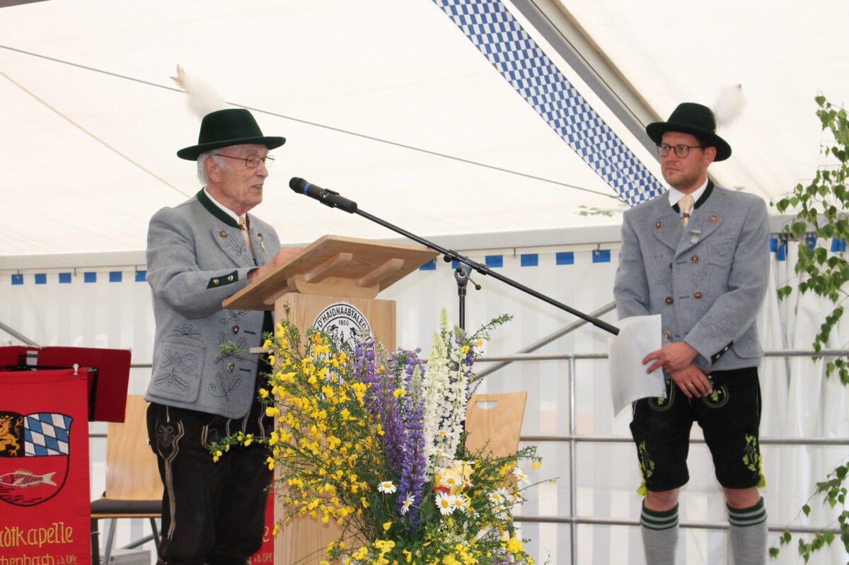 Über diese Entwicklung, die die Frucht von „Leidenschaft, Einsatz und Herzblut vieler Gleichgesinnter“ sei, freute sich insbesondere Gründungs- und Ehrenmitglied Bernhard Hartmann, der den 1950 im Gasthof seiner Familie gegründeten Verein von 1986 bis 1993 geleitet und gemeinsam mit Gattin Helene die Schirmherrschaft für das Fest übernommen hatte. Hartmann erinnerte an den Initiator des „Volks- und Gebirgstrachtenvereins“ Martin Steinkohl, einen aus Miltach stammenden Niederbayern, der die Gemeinschaft bis 1972 leitete, und wünschte dem Verein „für weitere 75 Jahre“, dass es ihm gelingen möge, „viele Heimatverbundene für die Trachtenbewegung zu begeistern“. Dies erhoffte sich auch der aktuelle Vereinsvorsitzende Johannes Pamler.