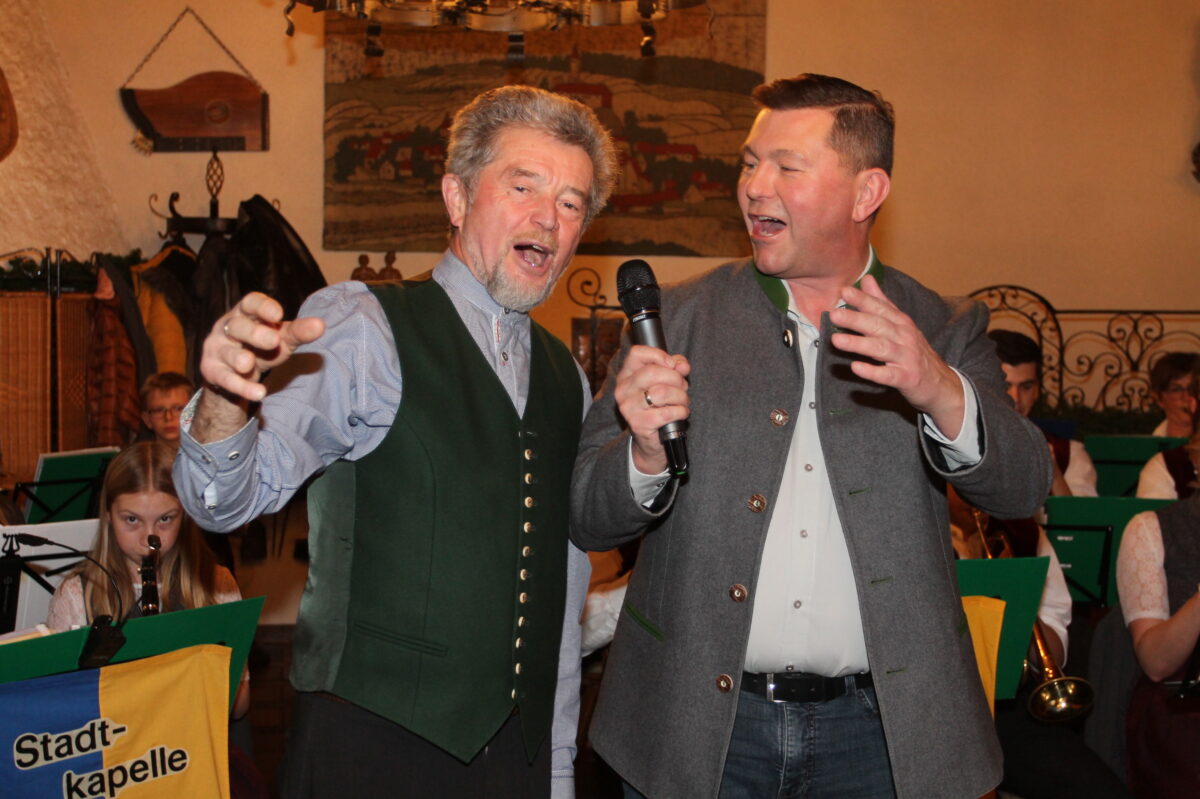 Da spielen die Musiker längst in Hochform und begeistern in Richtung Konzertende etwa mit der „Böhmischen Liebe“ oder laden bei der „Kuschelpolka“ zum Zusammenrücken ein. Nicht fehlen dürfen der 1943 von Johann Sax (1900 bis 1986) komponierte „Pleysteiner Marsch“. Und da zeigt Rainer Rewitzer beim Dirigieren, dass er etwas von Musik versteht. Der Bürgermeister huldigt als Sänger zusammen mit seinem Amtsvorgänger Johann Walbrunn außerdem „Dem Land Pleystein“. Der Text dazu stammt von Margit Fürnrohr nach der Melodie „Dem Land Tirol“. Natürlich dürfen Zugaben nicht fehlen, darunter der „Böhmische Traum“ und „Auf der Vogelwiese“.