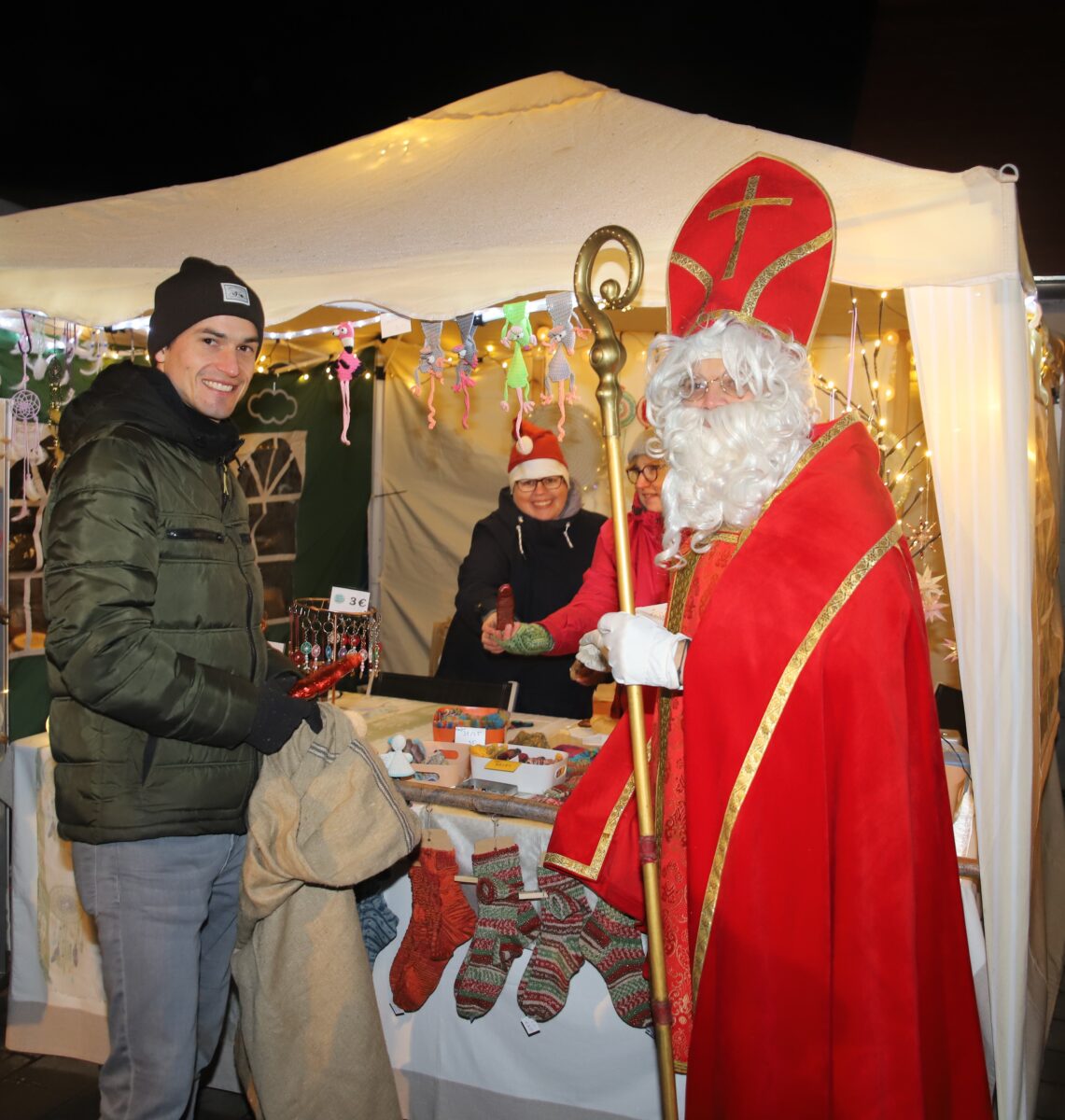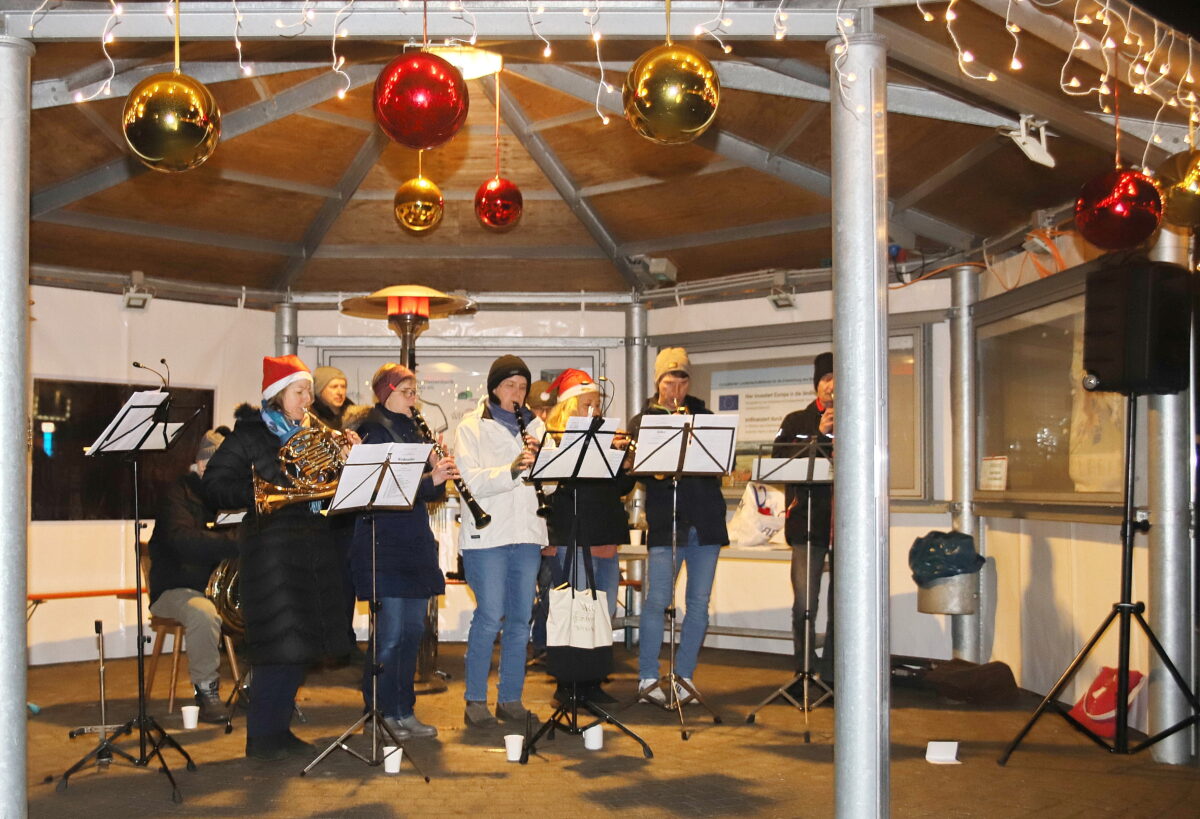 Die Vereine, die dieses Jahr wieder mitmischten, waren der Tennisclub, die Freiwillige Feuerwehr, die CSU, die SPD sowie die UPW. Der Ablaufplan startete chronologisch mit dem „Ökumenischen Adventsfenster“. Besinnlichkeit brachten Pfarrerin Heidi Landgraf und Pfarrer Berthold Heller auf den Platz an der Weidener Straße und später zog der Nikolaus seine Kreise. Er beschenkte die Kinder und Aussteller mit Schokolade. Für ausgesuchte, weihnachtliche Live-Musik sorgte eine Formation der Blaskapelle Etzenricht auf ihrem Stammplatz im festlich gestalteten, dort fest installierten Pavillon. Unter Regie der Kapelle spielten die Nachwuchsmusiker auf ihren Flöten ein Ständchen.