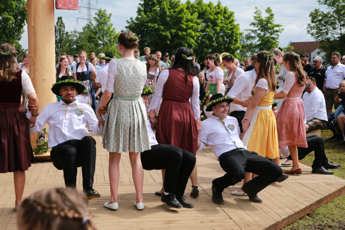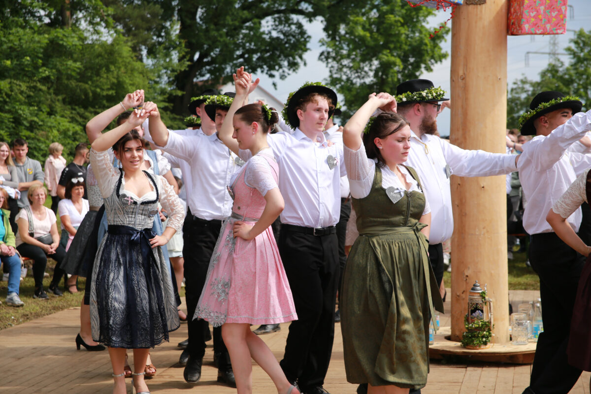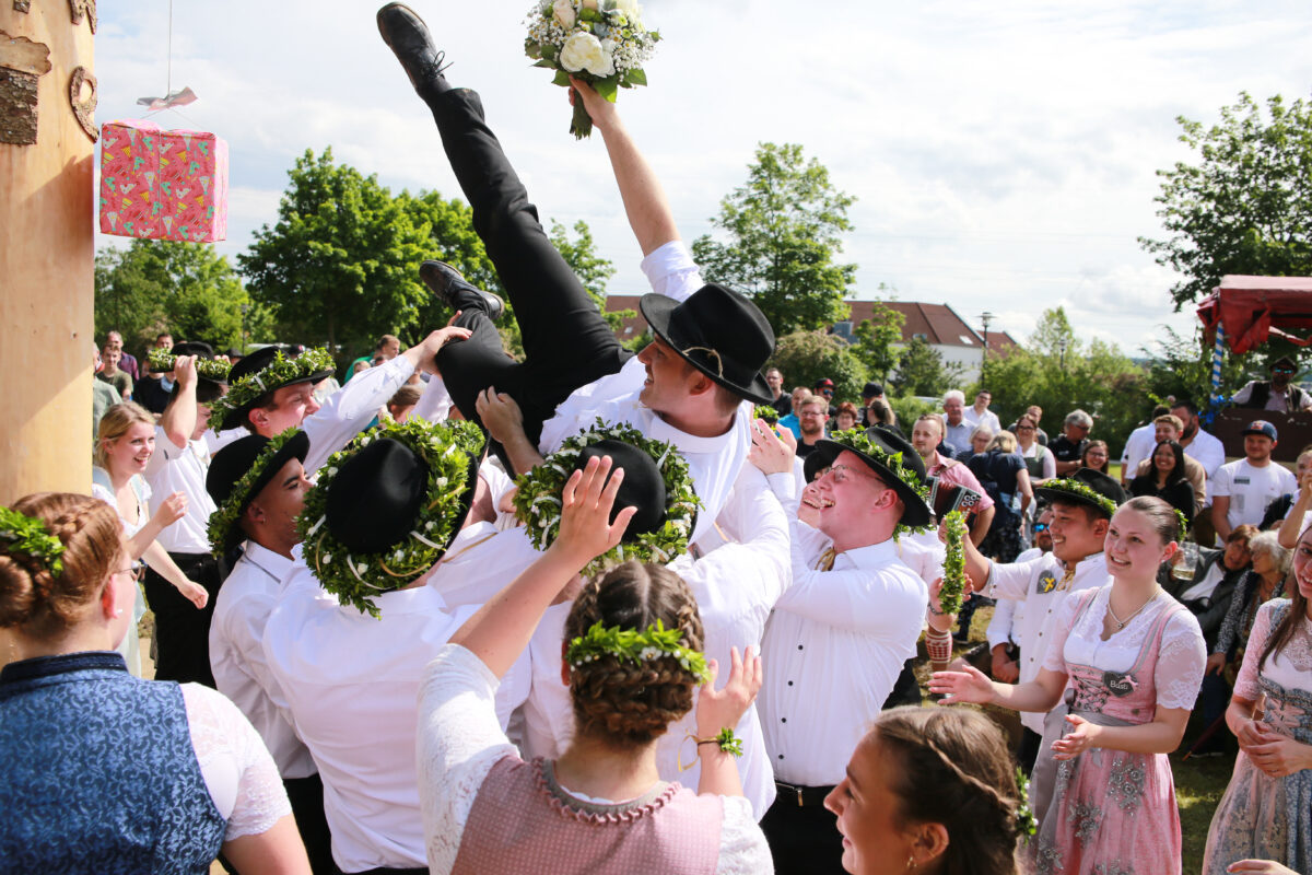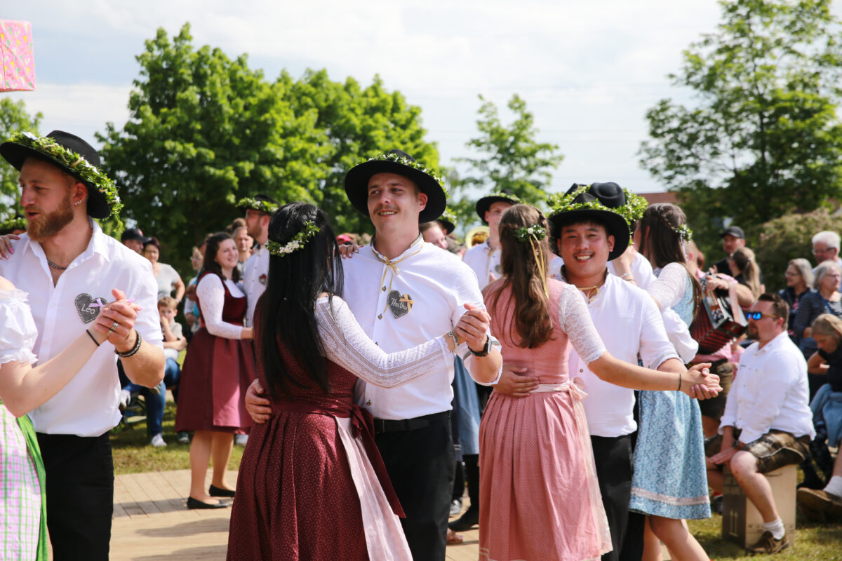 Mit einem Traktor kamen die Kirwapaare, begleitet von der Musikgruppe D’Allerscheynsten, zum Festplatz gefahren, wo sich ein paar Sonnenstrahlen und viele neugierige Zuschauer versammelt hatten. Tanzlehrer Michael Streber hatte mit den feschen 21 Paaren viele Tänze vorbereitet. Den Abschluss bildete ein Walzer, bei dem ein Blumenstrauß seine Runden drehte. Als die Musik verstummte, war klar: Das neue Oberkirwapaar bilden Cosima Mrugalla und Tobias Käßner.