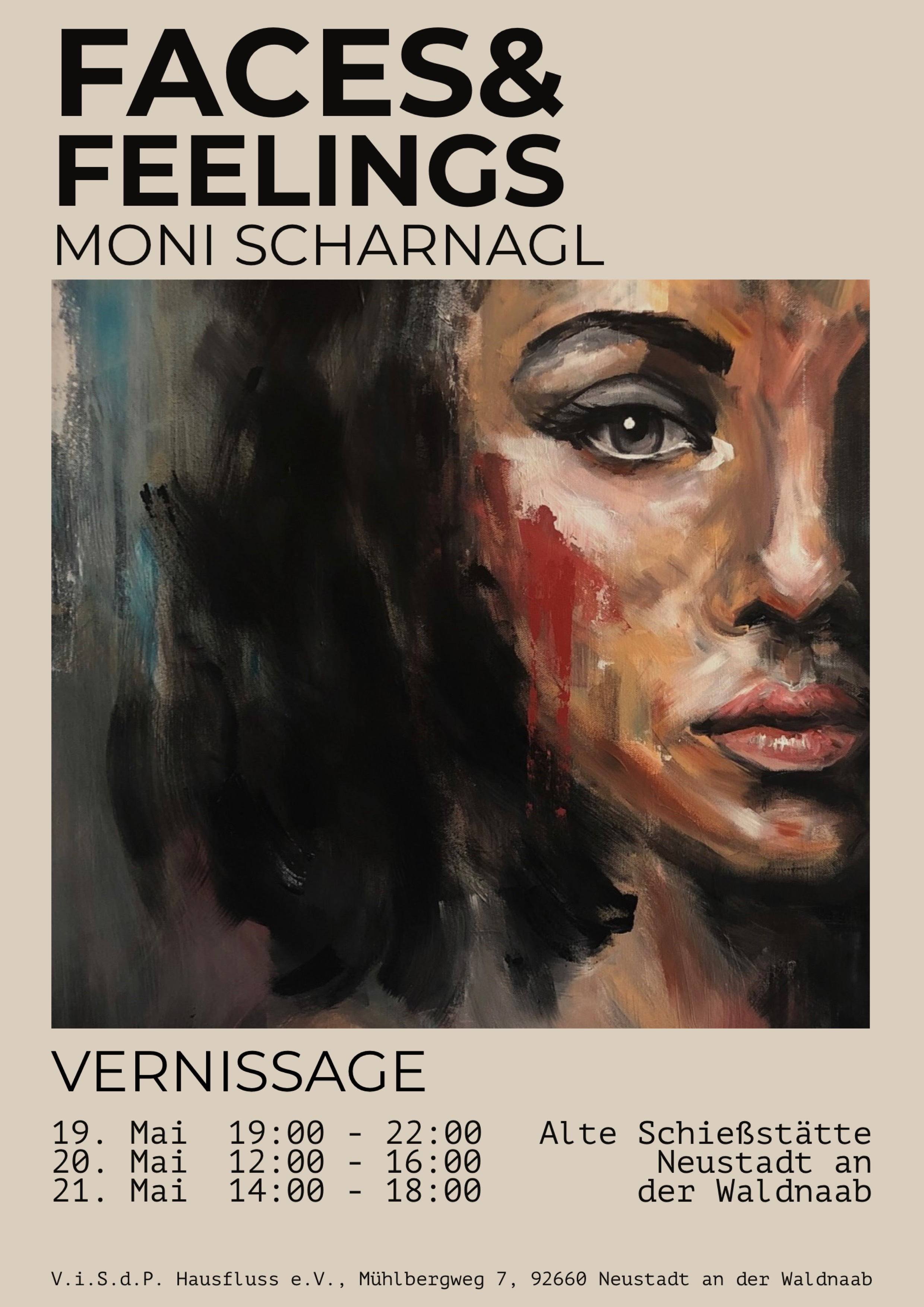 Am 19. Mai lädt der Kunst- und Kulturverein Hausfluss e. V. in der Alten Schießstätte in Neustadt um 19.00 zu einer Vernissage mit dem Thema „Face & Feelings“ der jungen Neustädter Künstlerin Moni Scharnagl ein. Die Ausstellung ist zudem am 20. Mai von 12.00 Uhr bis 16.00 Uhr und am 21. Mai von 14.00 bis 18.00 geöffnet. Die Künstlerin ist persönlich anwesend.