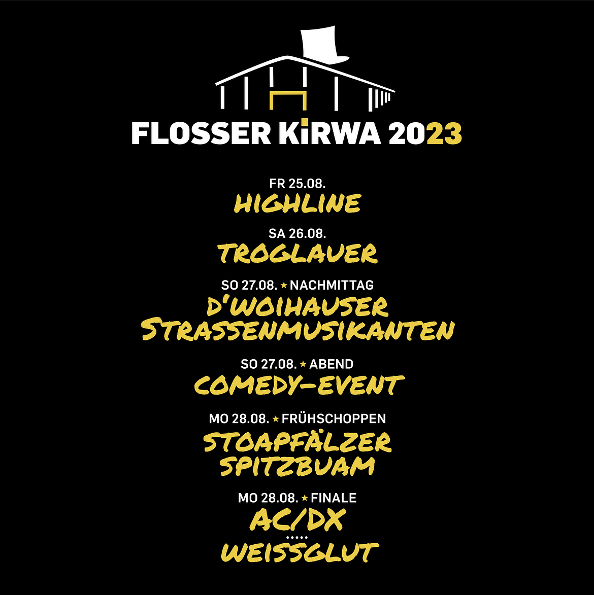 Der Startschuss fällt am Freitag mit den Dauergästen der Kirwa, mit “Highline”. Am Samstag heißt es dann „Heavy Volksmusik“ – die “Troglauer” versprechen eine unbeschreibliche Partynacht. Am Sonntag spielen ab 14 Uhr „d’Woihauser Straßenmusikanten“ auf und am Abend gib es mächtig was auf die Lachmuskeln beim „Comedy-Abend“.