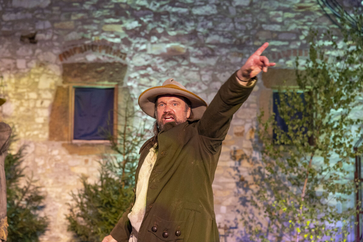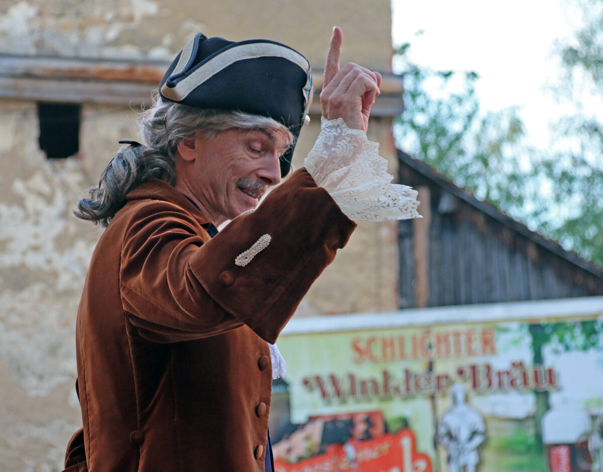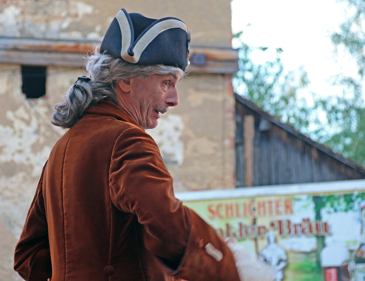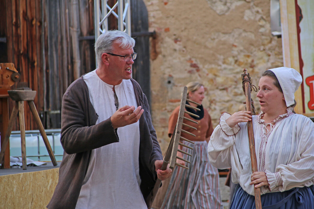 „Mei Fredi is weg, hat jemand mein Fredi gseng?“, quäkt Stefan Seider als Brauer Schlicht, während er über den Platz marschiert. Die Bauersleut reden erst einmal weiter ungerührt durcheinander. „Fredi, wo is mei Fredi?“ Ein Bauer fragt mal vorsichtshalber nach: „Wen?“ – „Den Fredi, meinen Rappen.“ – „Was für einen Rappen?“, will eine Bäuerin wissen. „Ja, meinen halt“, ruft der Schlicht gereizt. „Im Stall ist er nicht. Auf der Koppel nicht. Und im Schlag beim Schmied ist er auch nicht.“