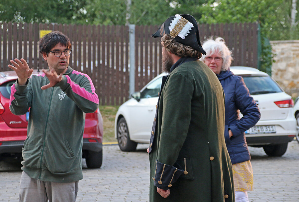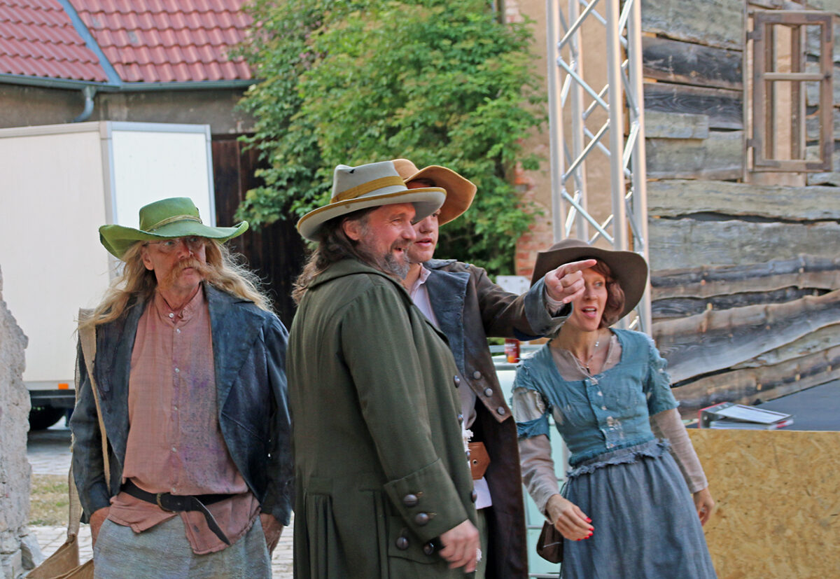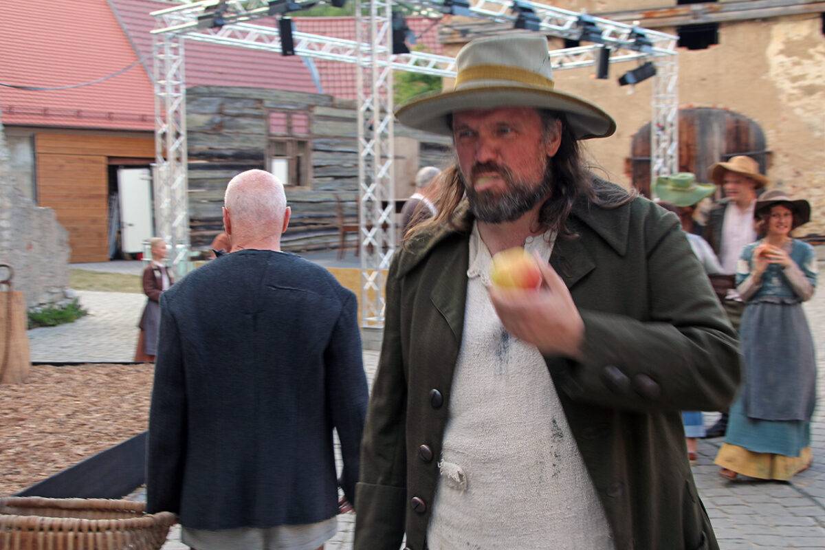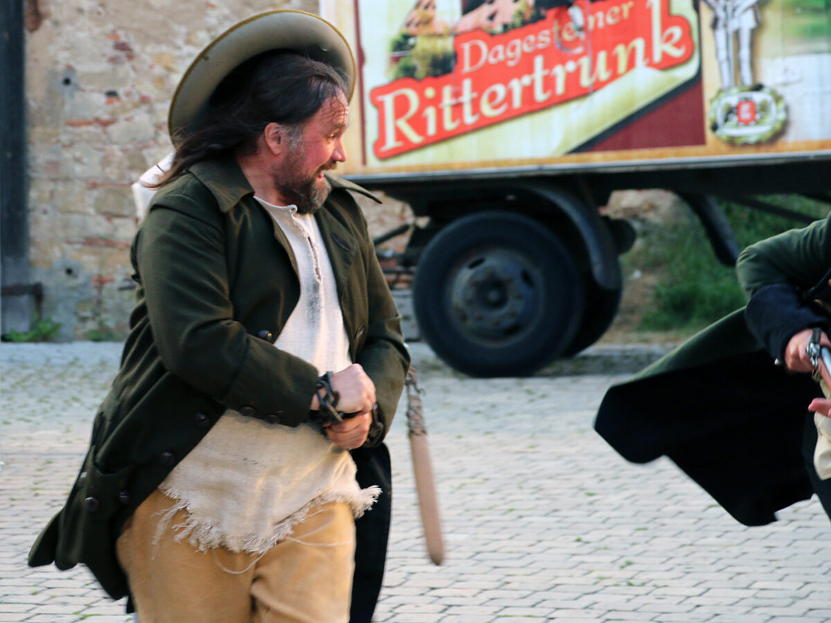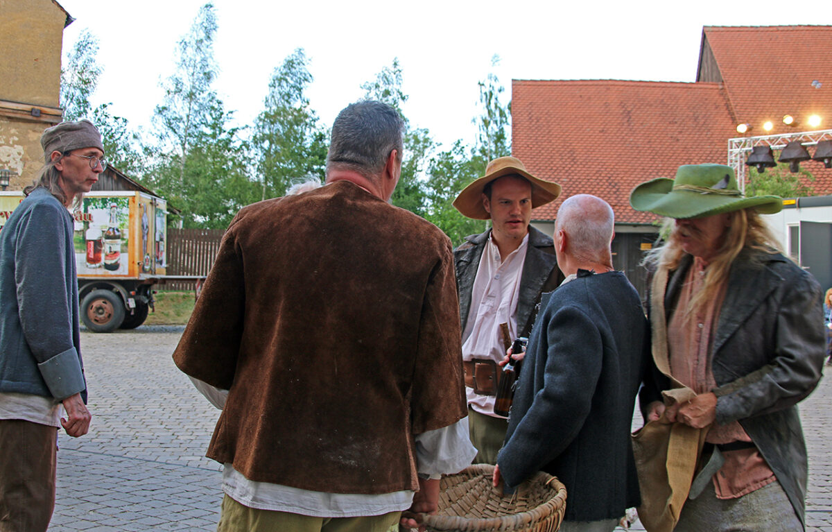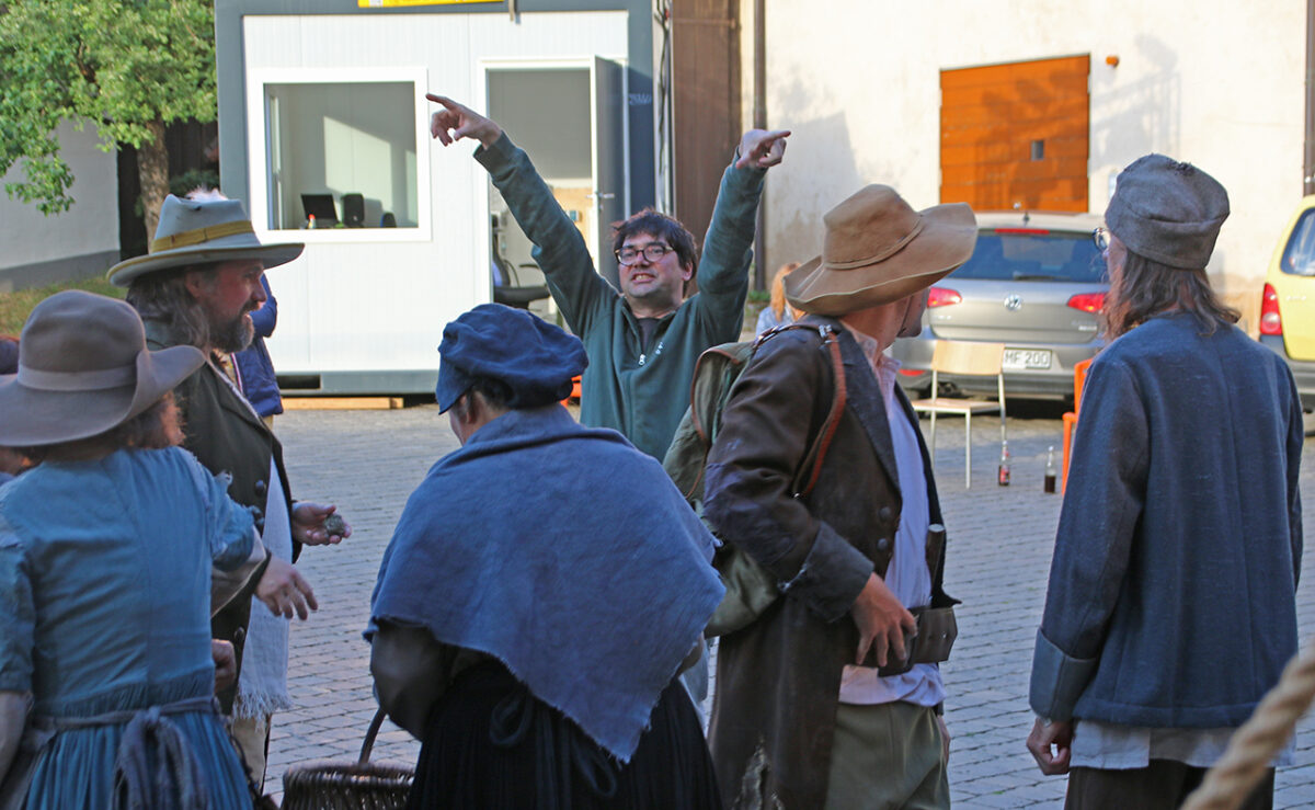 Stattdessen kommt Regisseur Rickelt angetrabt: „Super gebaut“, lobt er den Szenenaufbau. Zu den Räubern gewandt schränkt er ein: „Es wird nur noch nicht klar, dass ihr eine Gang seid.“ Till in seinem Element: Demonstrativ greift er in den Korb. Sooo nämlich. Der Zuschauer muss sehen, was da passiert, im Gegensatz zu den bestohlenen Bauern. Slapstick-Übertreibung wie bei Buster Keaton und den Männern ohne Nerven. „Es darf schon ein wenig Komik sein.“ Die Räuber dürfen ihr Mütchen kühlen. „Schauen wir mal, wie dreist man das treiben kann …“