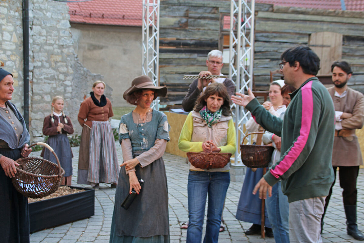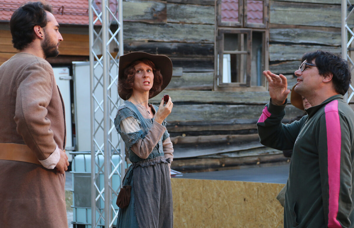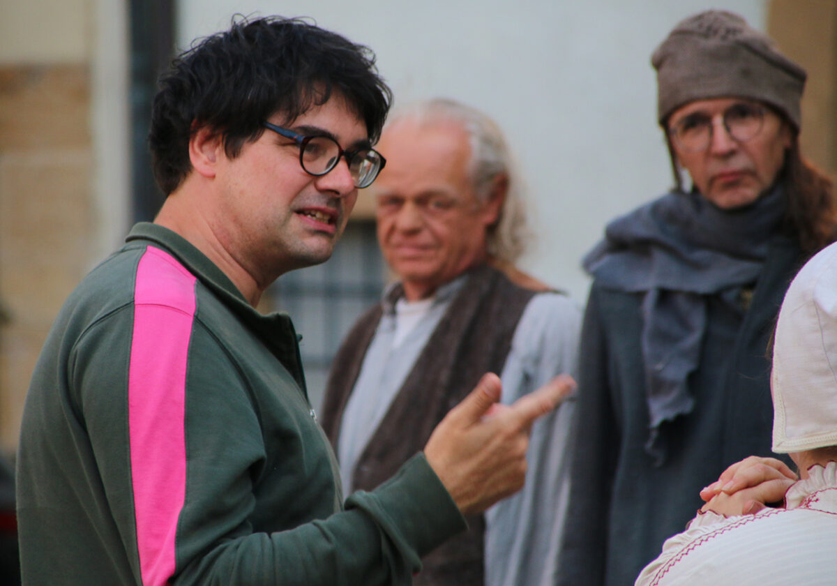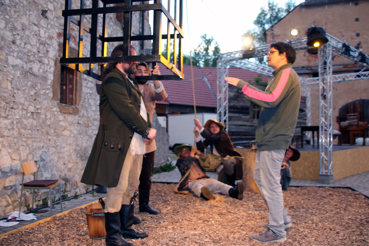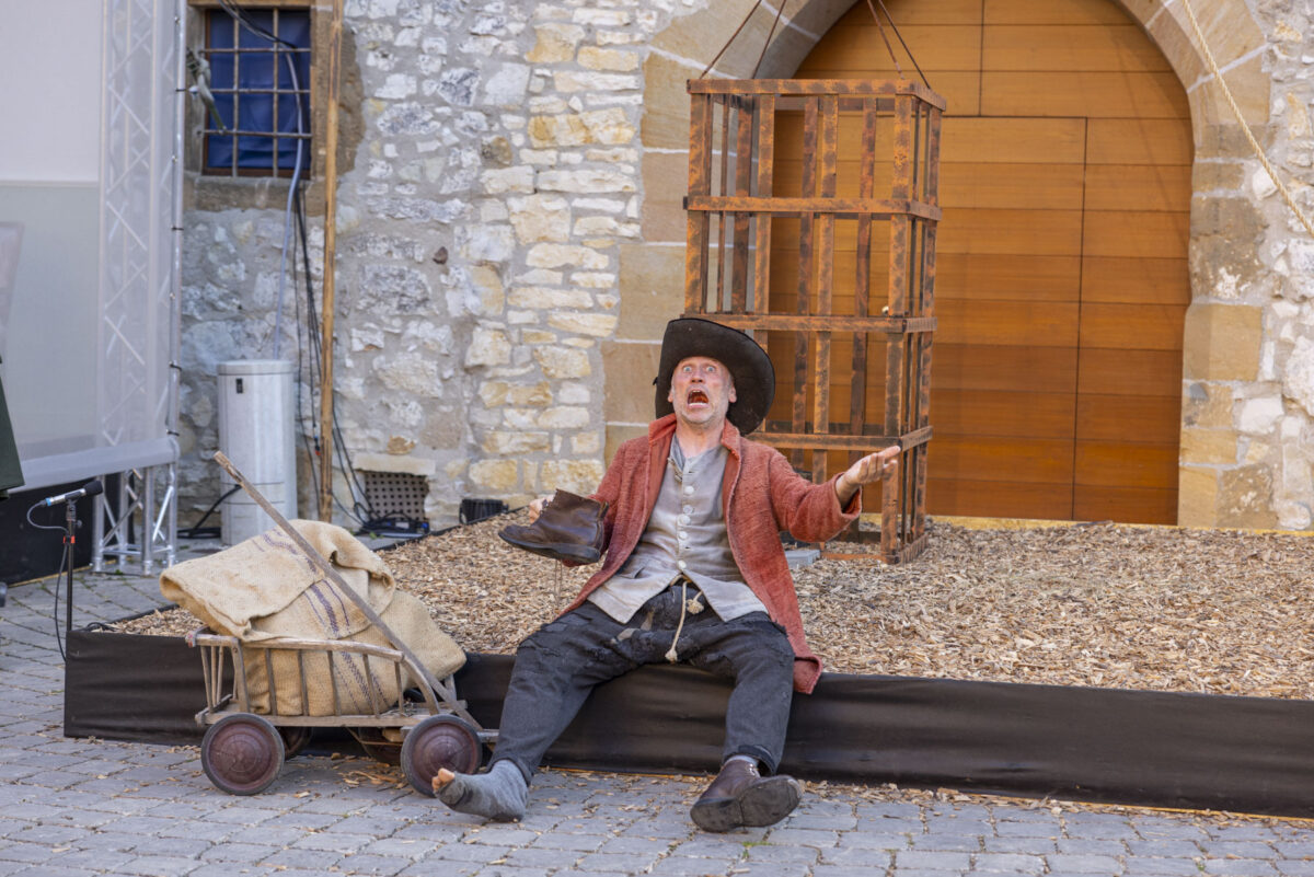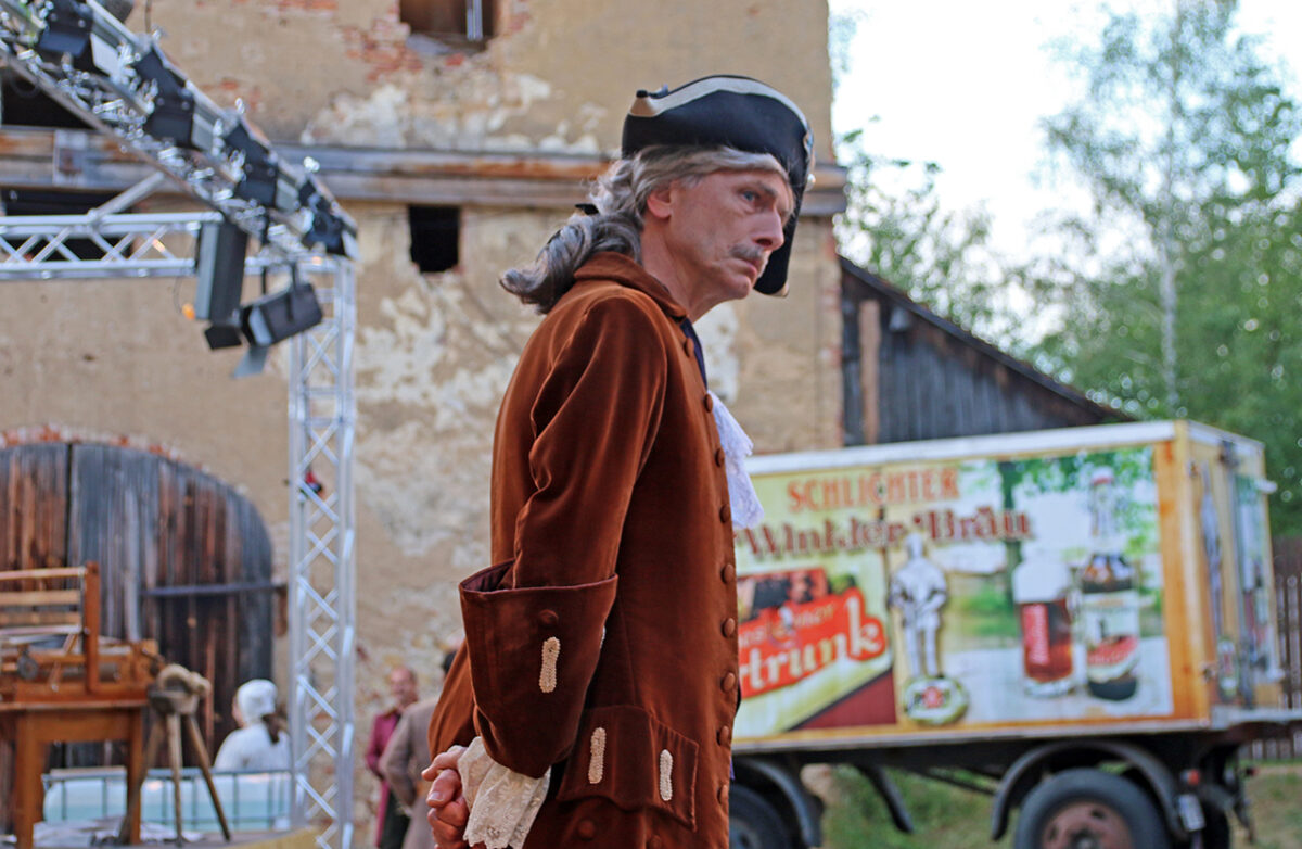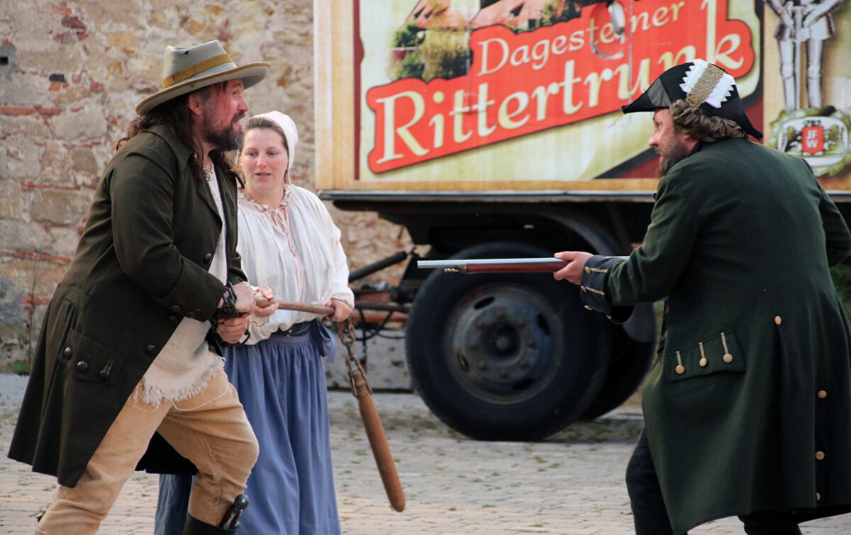 Stattdessen kommt Regisseur Rickelt angetrabt: „Super gebaut“, lobt er den Szenenaufbau. Zu den Räubern gewandt schränkt er ein: „Es wird nur noch nicht klar, dass ihr eine Gang seid.“ Till in seinem Element: Demonstrativ greift er in den Korb. Sooo nämlich. Der Zuschauer muss sehen, was da passiert, im Gegensatz zu den bestohlenen Bauern. Slapstick-Übertreibung wie bei Buster Keaton und den Männern ohne Nerven. „Es darf schon ein wenig Komik sein.“ Die Räuber dürfen ihr Mütchen kühlen. „Schauen wir mal, wie dreist man das treiben kann …“