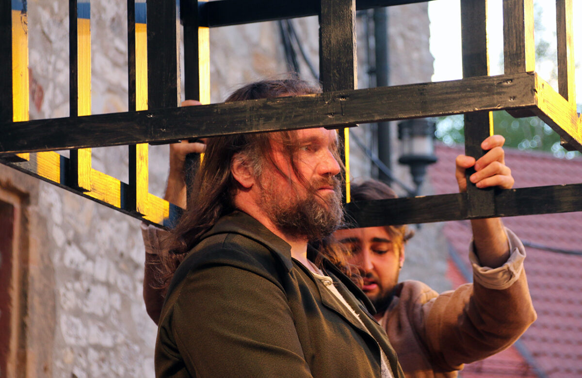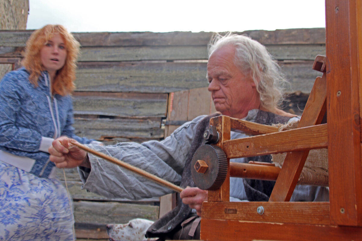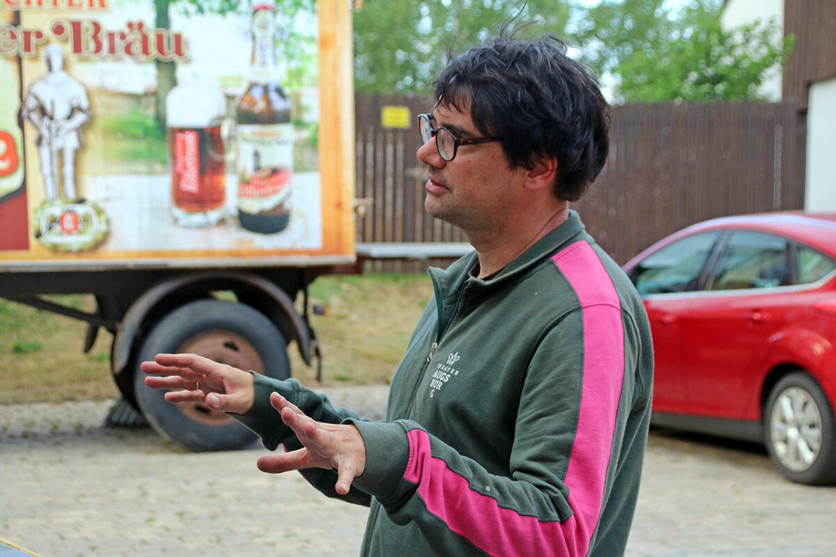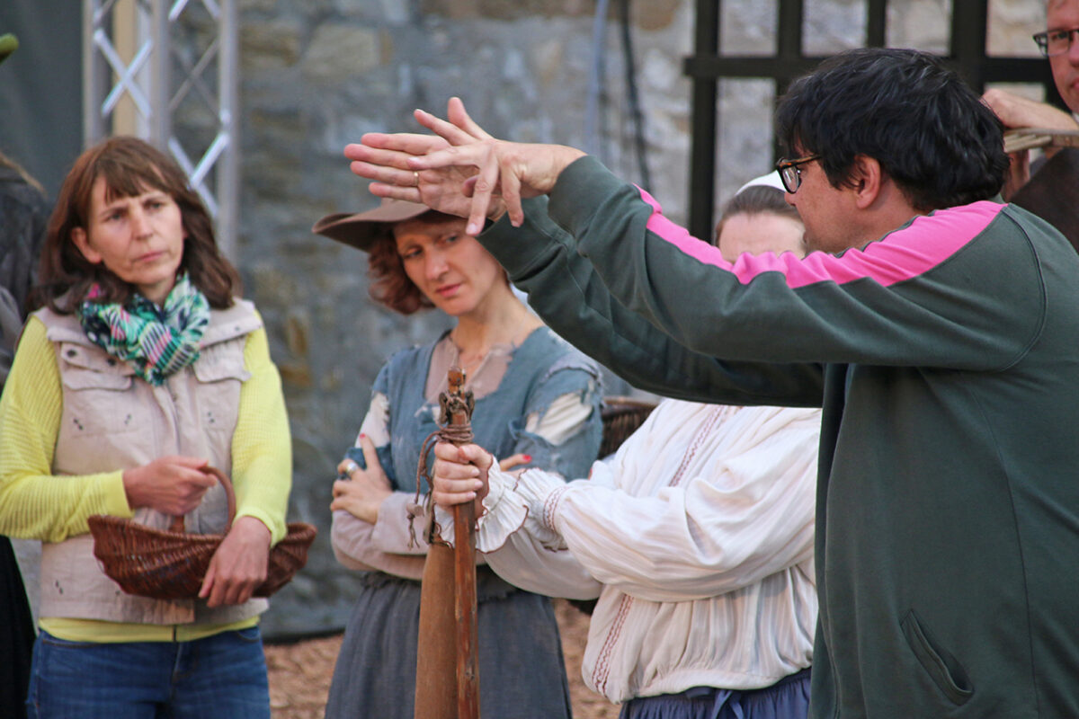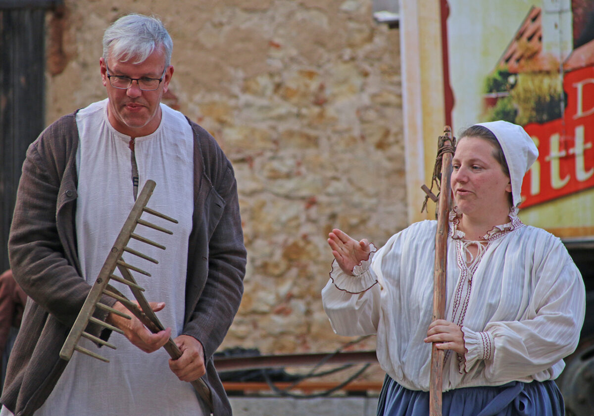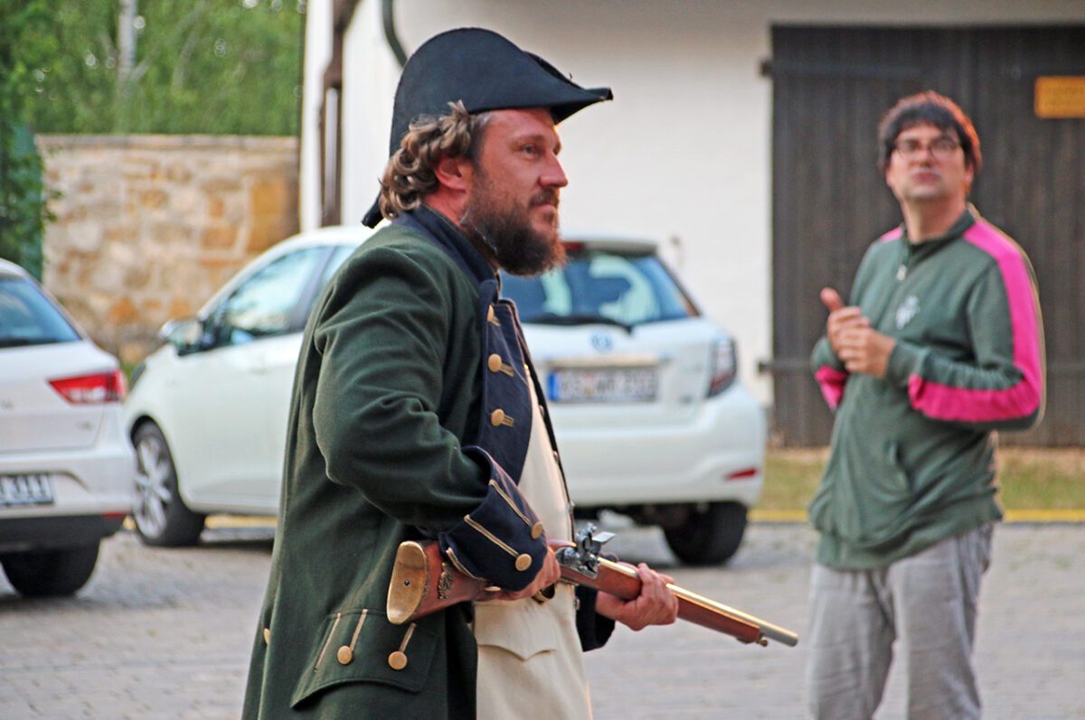 Stattdessen kommt Regisseur Rickelt angetrabt: „Super gebaut“, lobt er den Szenenaufbau. Zu den Räubern gewandt schränkt er ein: „Es wird nur noch nicht klar, dass ihr eine Gang seid.“ Till in seinem Element: Demonstrativ greift er in den Korb. Sooo nämlich. Der Zuschauer muss sehen, was da passiert, im Gegensatz zu den bestohlenen Bauern. Slapstick-Übertreibung wie bei Buster Keaton und den Männern ohne Nerven. „Es darf schon ein wenig Komik sein.“ Die Räuber dürfen ihr Mütchen kühlen. „Schauen wir mal, wie dreist man das treiben kann …“