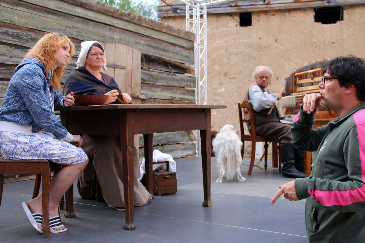 Sandra Zwack als Mutter Elisabeth setzt sich mit einem alten Hemd und einem Nähkorb an einen Tisch. Sie hält den zerrissenen Lumpen an den Schulterstücken hoch, schüttelt den Kopf. „Samma froh, dass wenigstens unsern Franzl ned ausghom ham.“ Troglauer Senior blickt giftig auf: „Des is nimmer unser Bua, des is a Haderlump, a Verbrecher“, spuckt er seinen Text aus. „Wie oft hab ich dir schon gsagt, ich will nicht, dass dem sein Namen auch nur noch ein einziges Mal da herinnen in unserer Stuben fällt.“ Regisseur Rickelt legt den Kopf schief: „Noch ein bisschen klarer, dass du Kälte spielst … du versteckst deine wahren Gefühle total – weiter an der Stelle …“