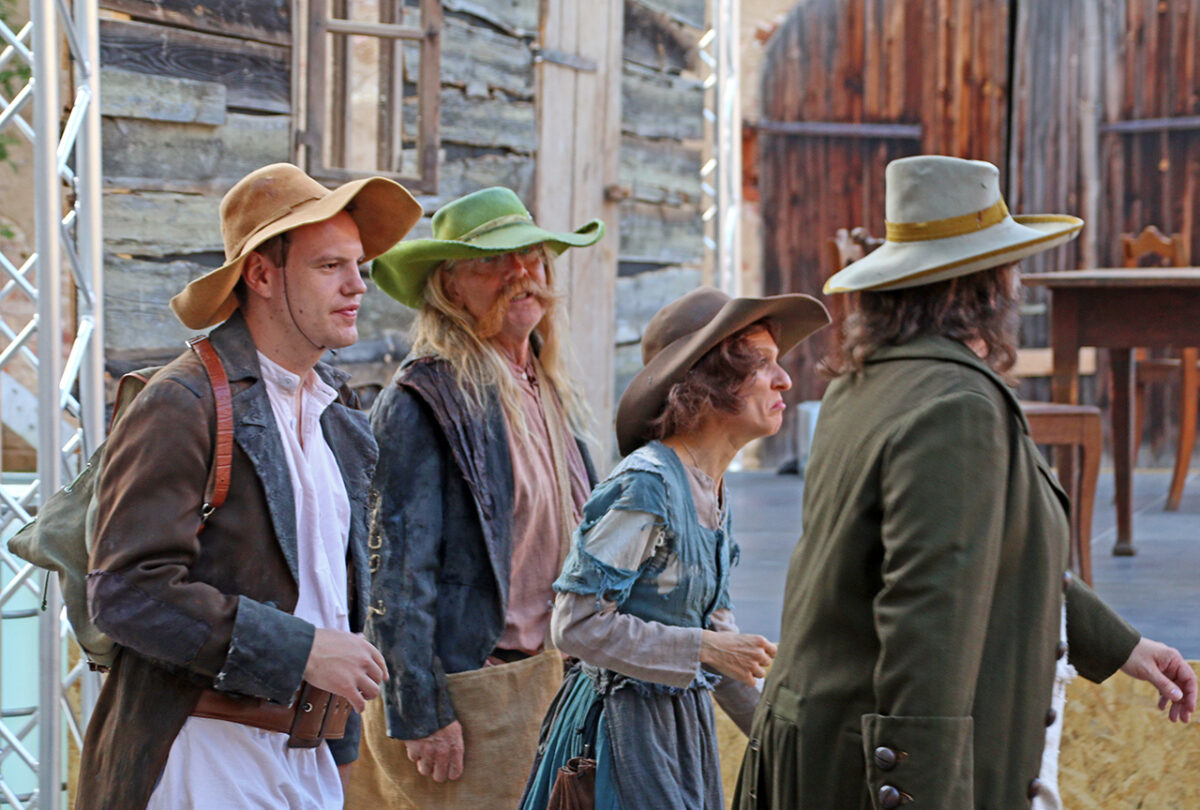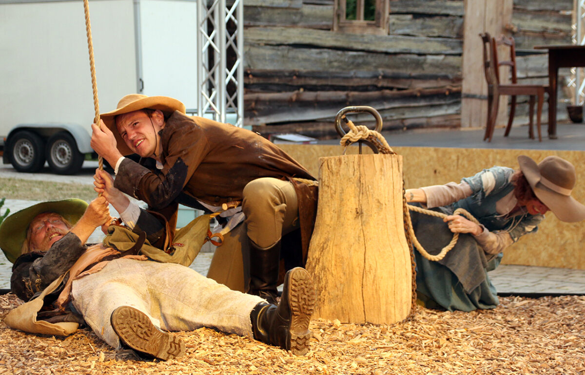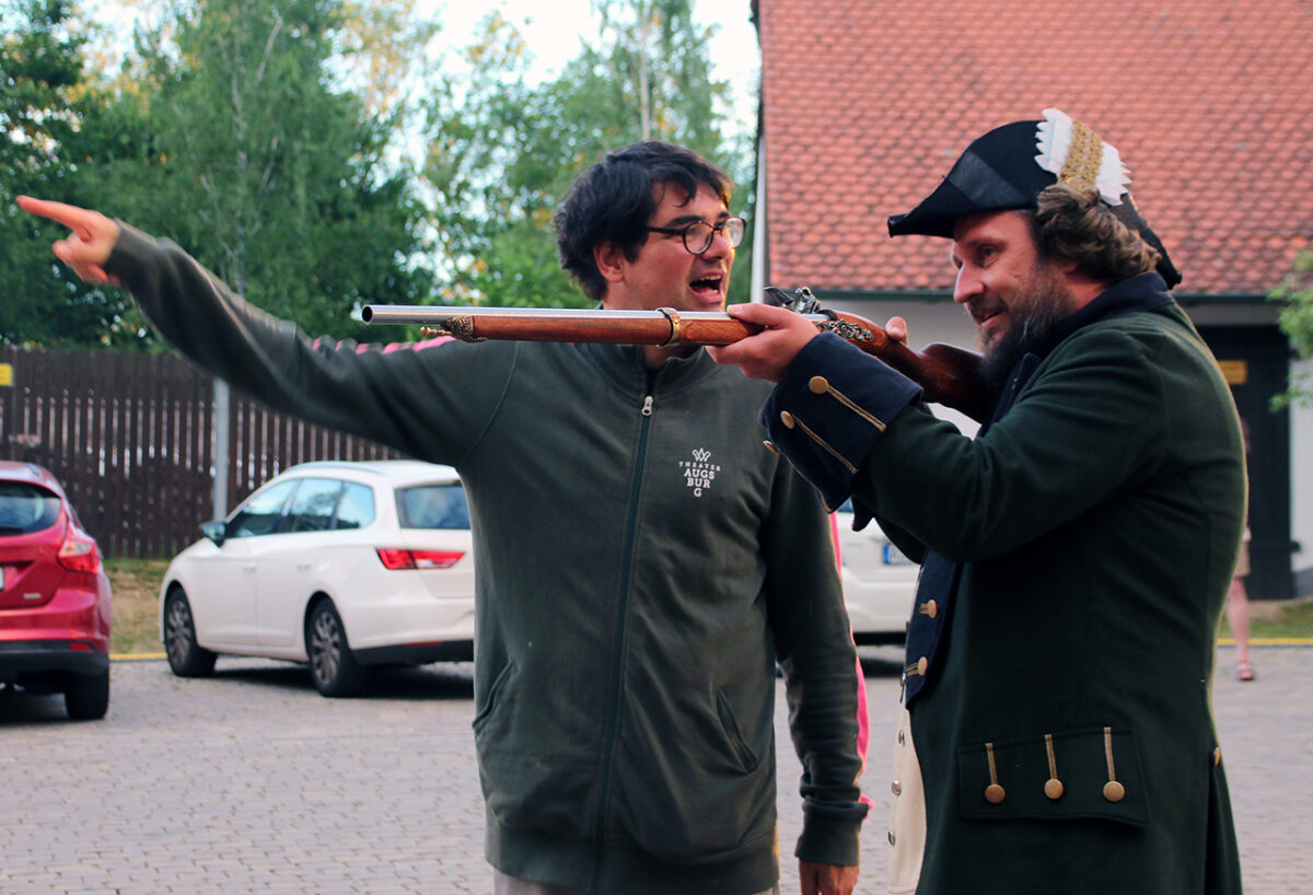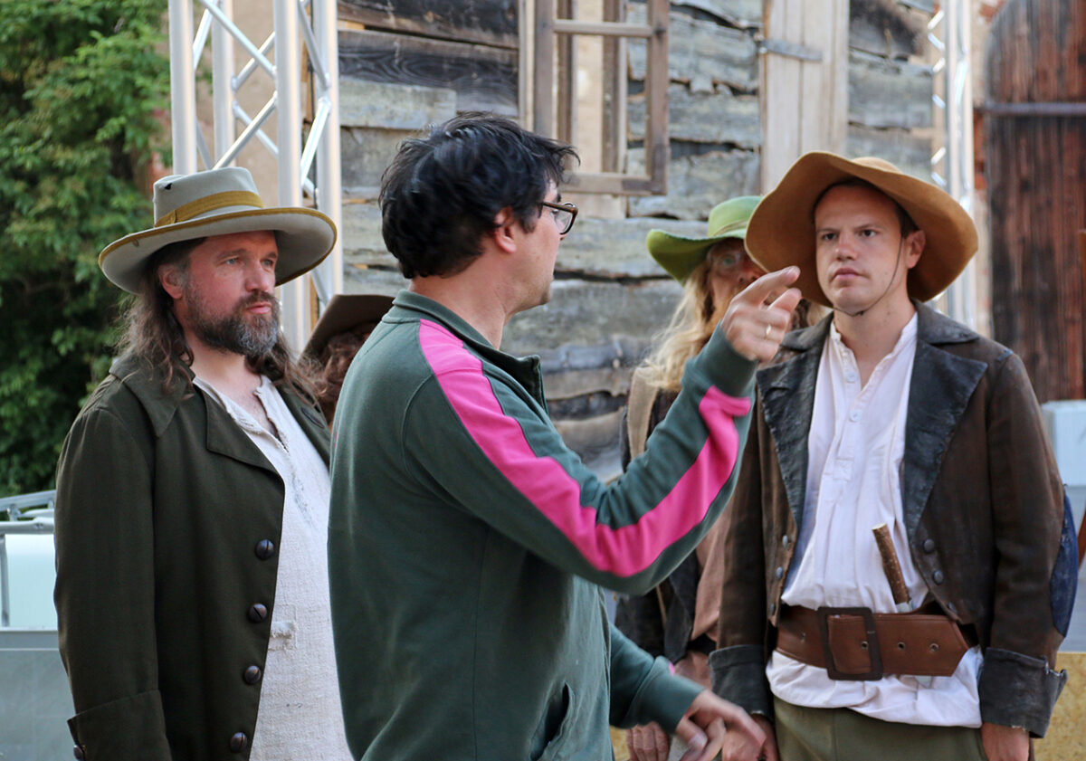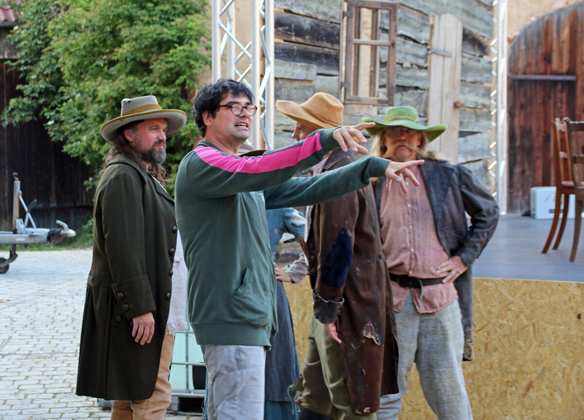 „Räuber, super, super, super“, lobt er die Bande. „Ihr dürft das ruhig mitkriegen, was euer Hauptmann treibt, ,oh der Troglauer traut sich aber was‘, dass ihr auch mal kurz guckt, bei dem schlafenden Gendarm“, kommt ihm eine spontane Idee. „Man könnte ihm die Flinte klauen.“ Schon ist er beim schnarchenden Tobias Meidinger, der gemütlich an einem Holzpfeiler lehnt. „Vielleicht ist es auch zu viel“, korrigiert er sich. Aber ausprobieren möchte er noch einiges: „Ihr könnt noch klarer in die Leute rein gehen, so ein bisschen Italo-Western denken, Sergio Leone“, schlägt er vor und mit seinem schwankenden Gang ist er jetzt ganz Quentin Tarantino in der Oberpfalz.