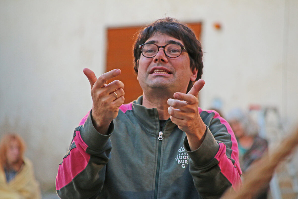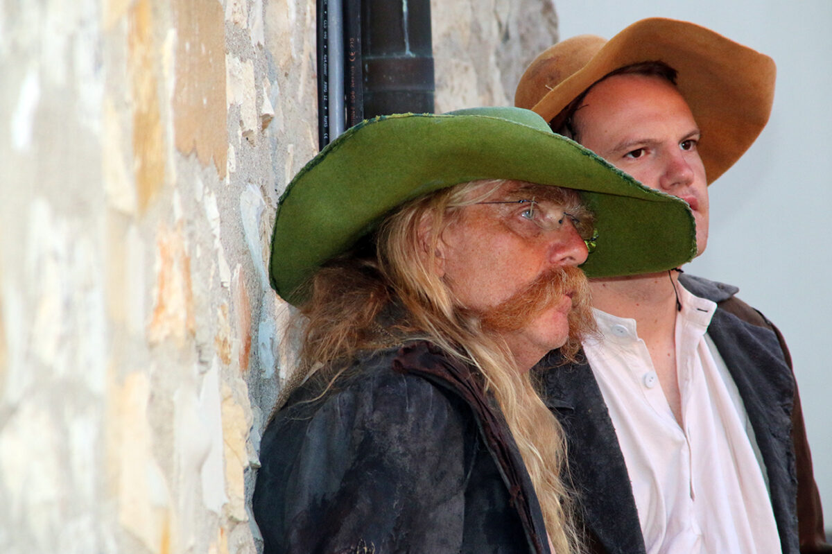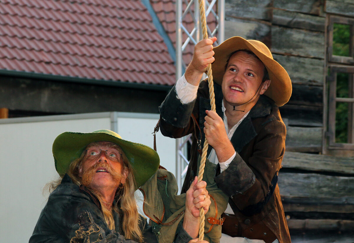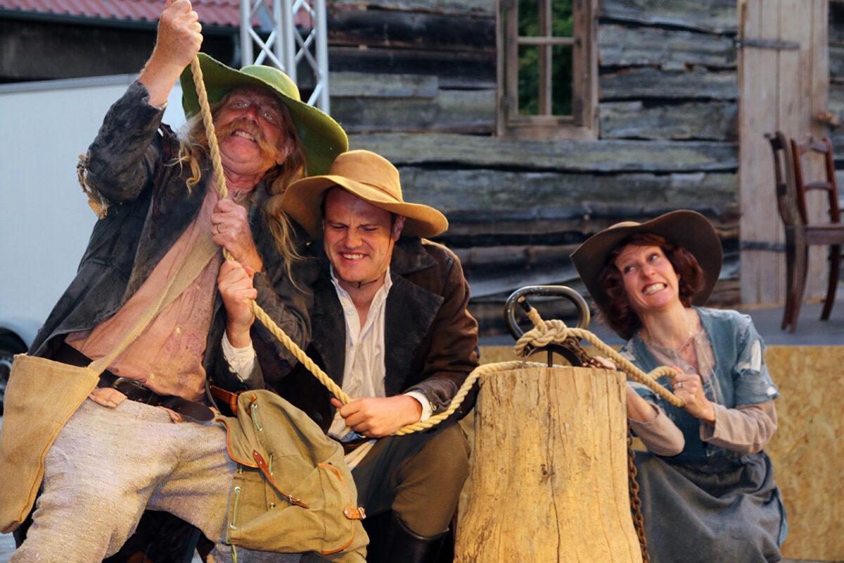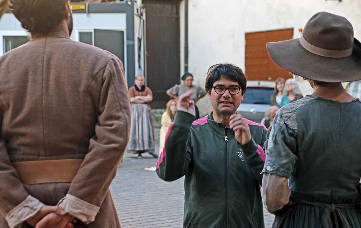 „Räuber, super, super, super“, lobt er die Bande. „Ihr dürft das ruhig mitkriegen, was euer Hauptmann treibt, ,oh der Troglauer traut sich aber was‘, dass ihr auch mal kurz guckt, bei dem schlafenden Gendarm“, kommt ihm eine spontane Idee. „Man könnte ihm die Flinte klauen.“ Schon ist er beim schnarchenden Tobias Meidinger, der gemütlich an einem Holzpfeiler lehnt. „Vielleicht ist es auch zu viel“, korrigiert er sich. Aber ausprobieren möchte er noch einiges: „Ihr könnt noch klarer in die Leute rein gehen, so ein bisschen Italo-Western denken, Sergio Leone“, schlägt er vor und mit seinem schwankenden Gang ist er jetzt ganz Quentin Tarantino in der Oberpfalz.